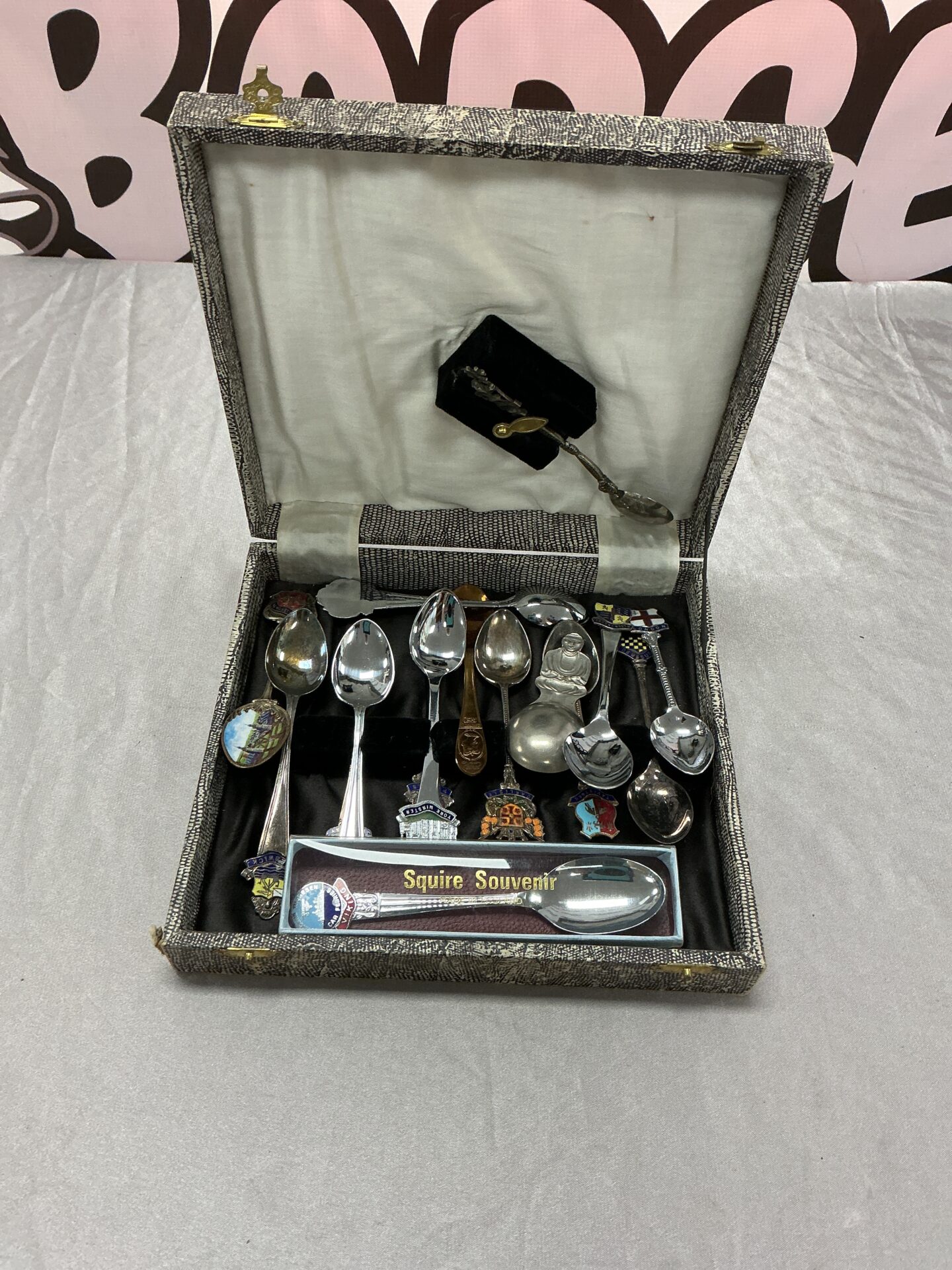 This vintage lot features a collection of silver-plated tea spoons, likely collected as souvenirs. The spoons showcase diverse designs representing landmarks and cultural symbols. Presented in its original box, this collection is ideal for collectors of vintage silverware or unique decorative items.