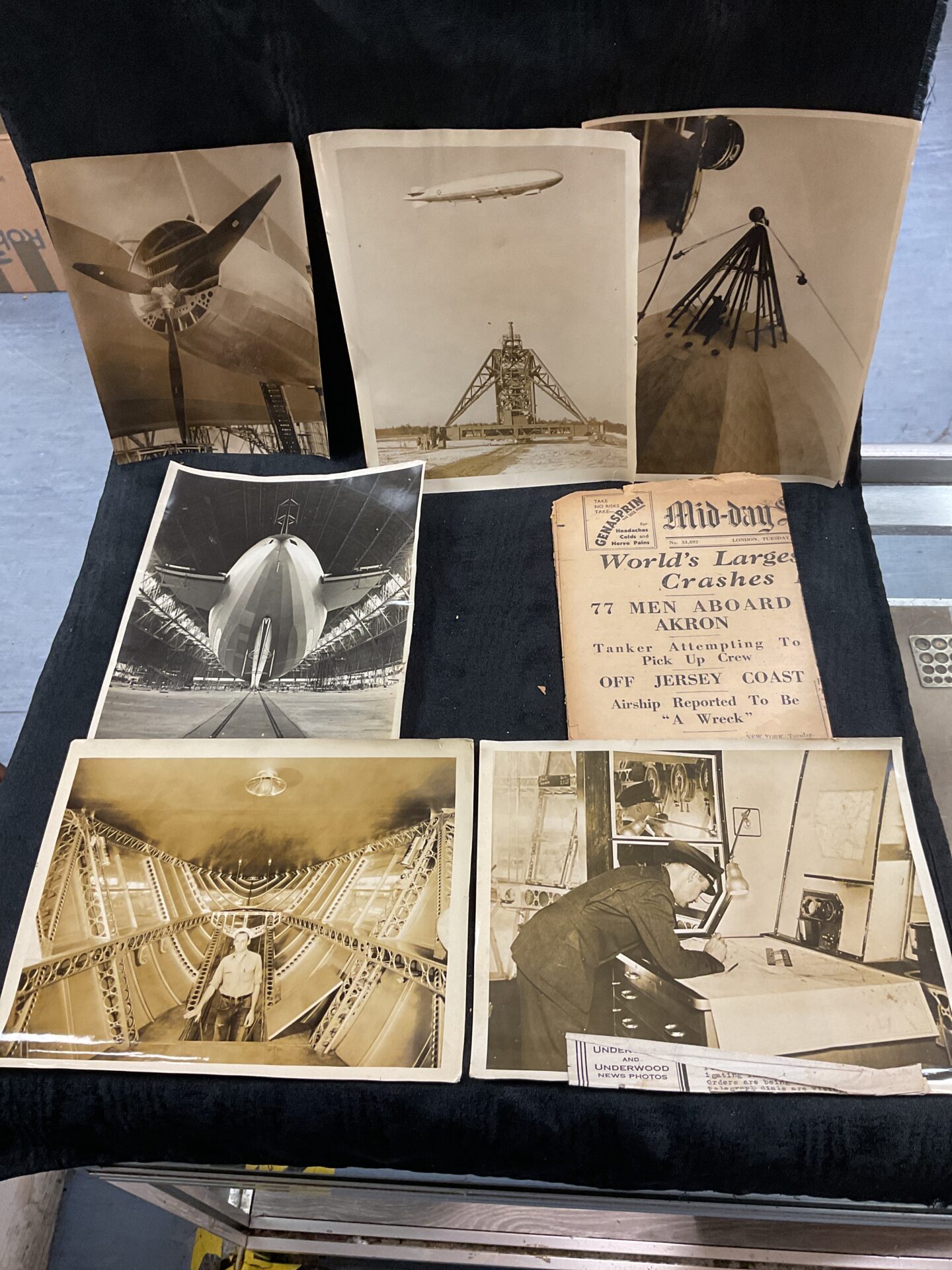 The photographs and clippings exhibit signs of age, including some foxing, creasing, and edge wear, consistent with their vintage. Despite these imperfections, the collection remains a fascinating and historically significant artifact for aviation enthusiasts and collectors of ephemera. This collection offers a rare opportunity to own a piece of aviation history, documenting both the promise and the perils of early airship travel.