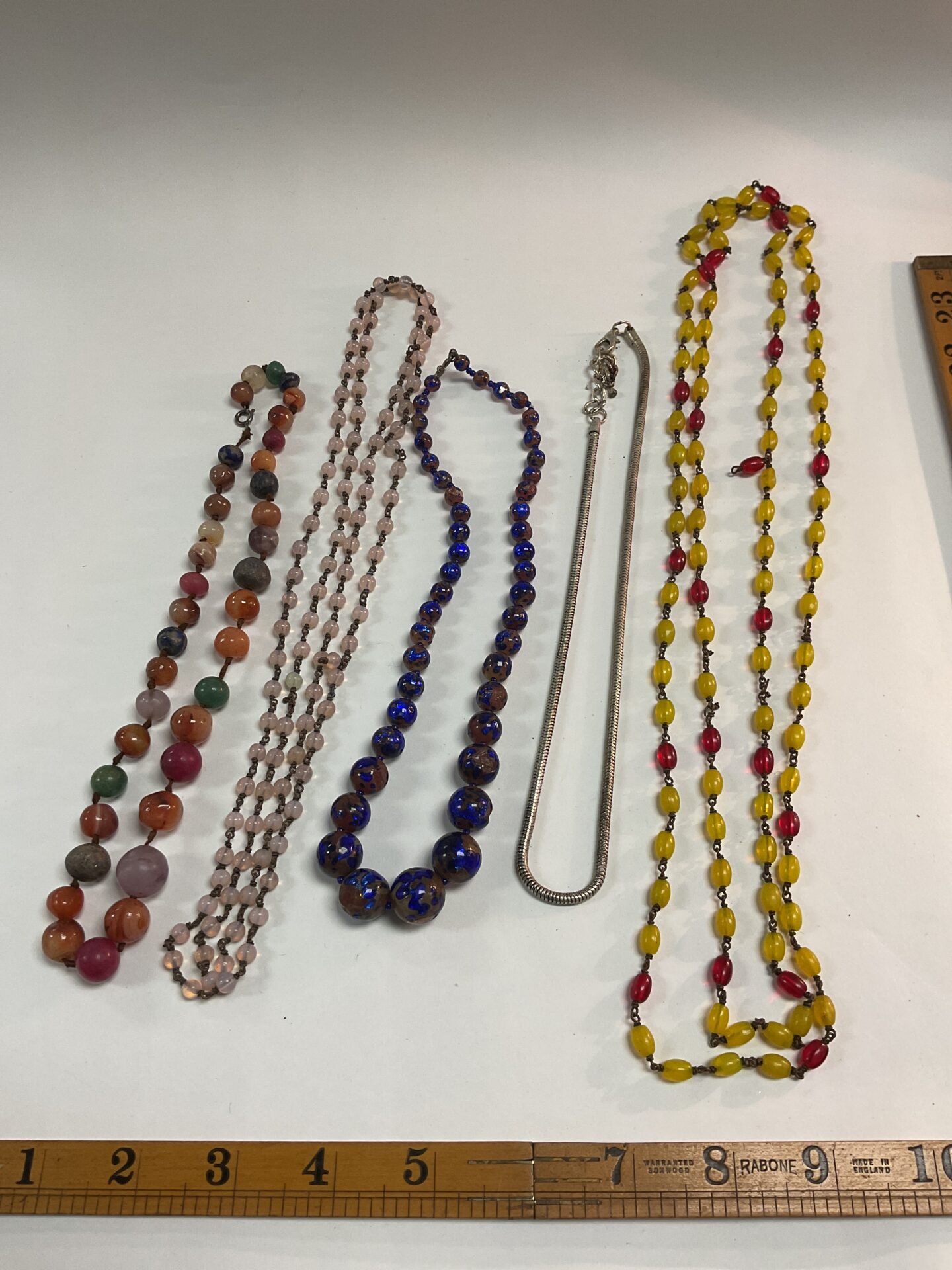 This lot features four colourful necklaces, including beaded designs in red, pink, blue, and amethyst, alongside a delicate snake link chain. These vintage pieces offer a variety of styles and colours, perfect for adding a touch of retro charm to any outfit or collection. A delightful addition for jewellery enthusiasts and collectors alike.