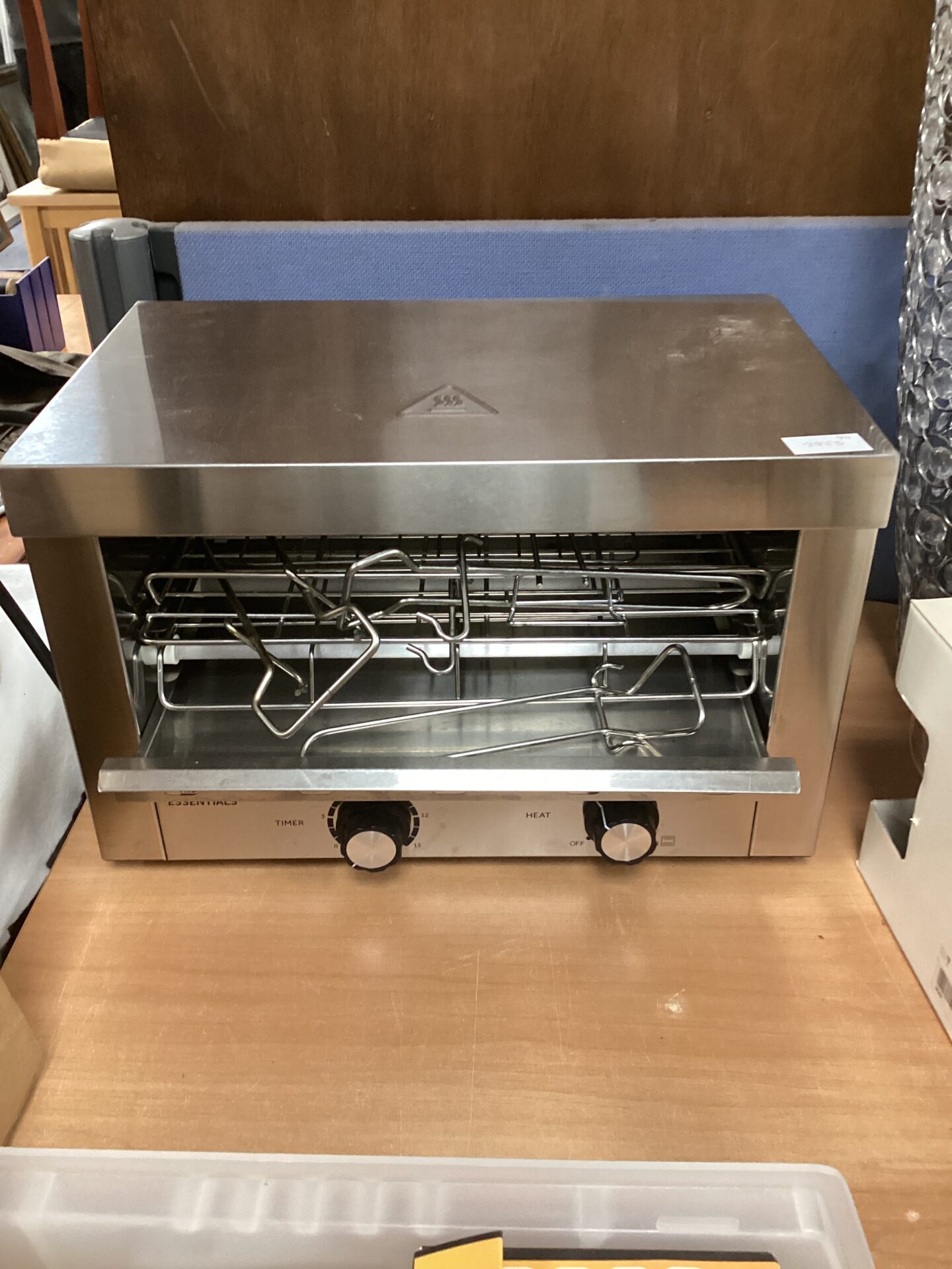 This is a commercial toaster grill, identified as a Nisbets Essentials Quarts model. Constructed from stainless steel, it features a robust build suitable for professional kitchen environments. The unit is designed for toasting bread, grilling sandwiches, and preparing other quick-service food items, offering a versatile solution for catering and food service businesses.