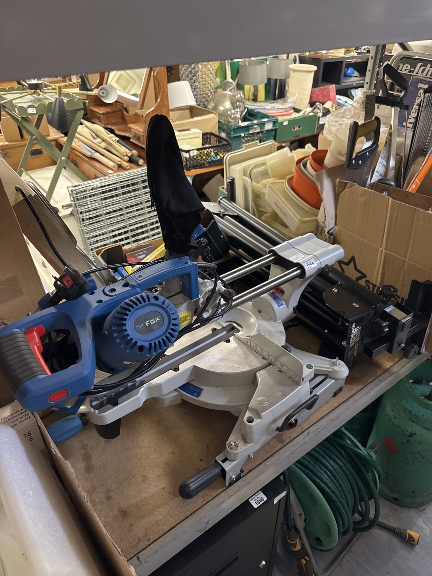 This mitre saw appears to be in unused condition, as stated by the previous owner. While the item has not been tested for functionality, its pristine appearance suggests it has been well-stored. This would be of interest to those seeking a quality power tool, or a collector of woodworking equipment.