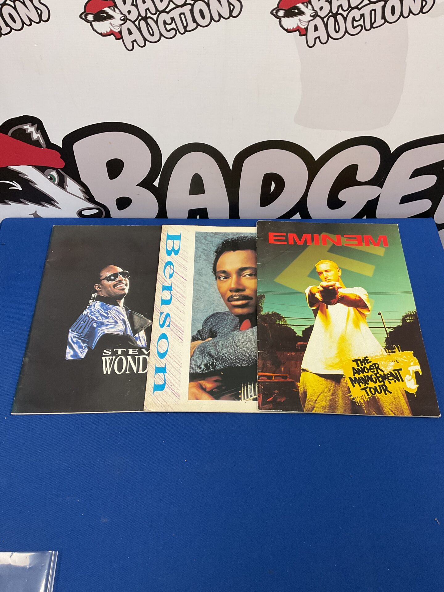 This lot comprises a collection of concert tour programmes featuring performances by musical icons Stevie Wonder, George Benson, and Eminem. These programmes represent a snapshot of music history, offering a glimpse into the live performances and touring schedules of these celebrated artists. The programmes likely contain details of the tour dates, venues, supporting acts, and potentially artist biographies or promotional material.