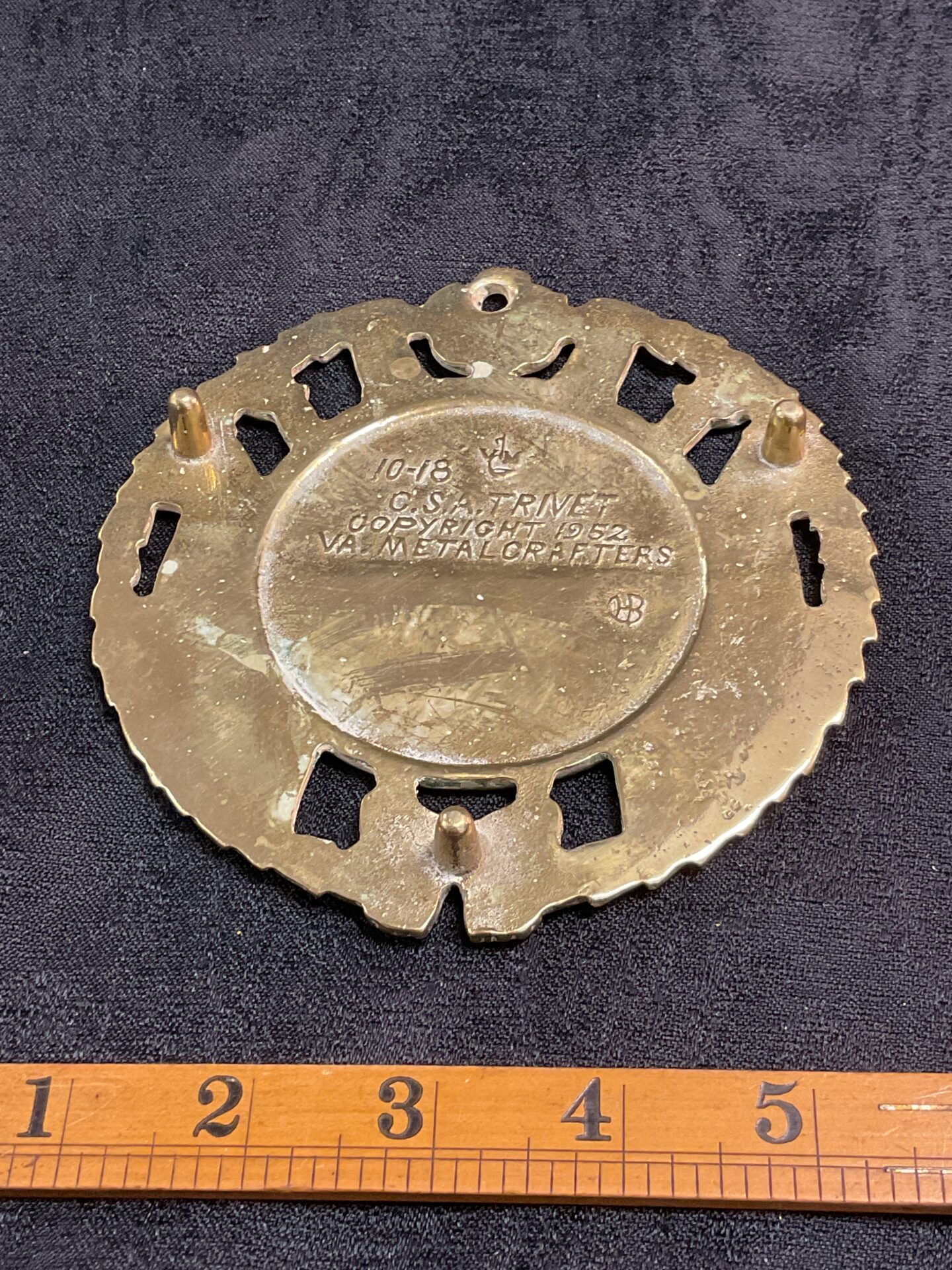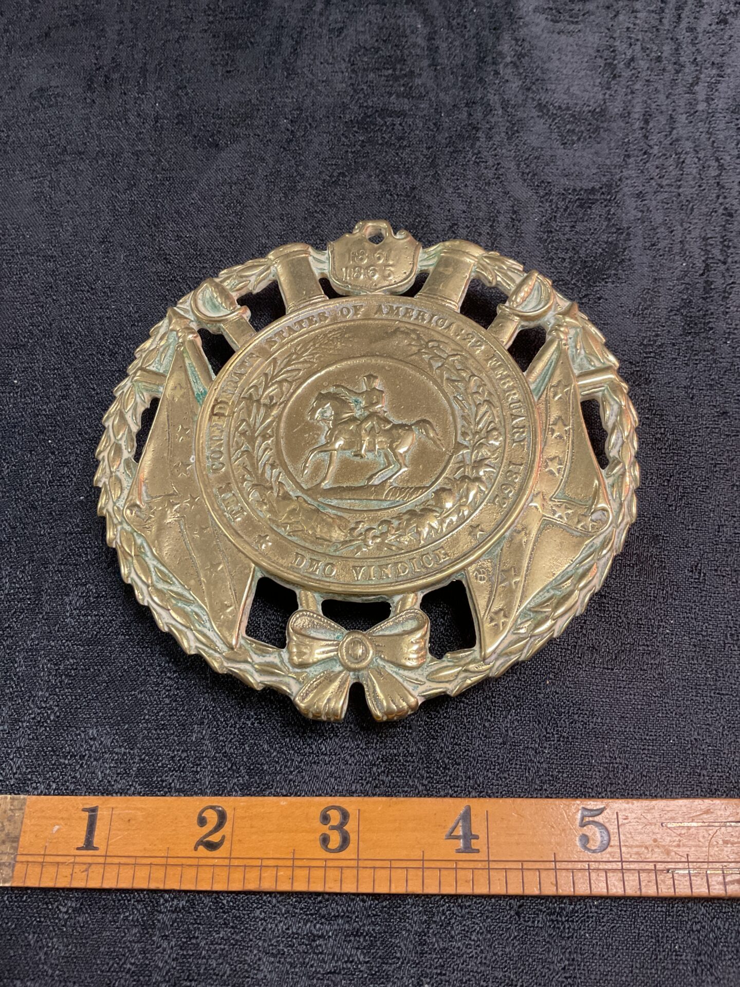 This is a decorative brass trivet cast in the form of the Confederate States of America seal. The central design features a depiction of Mercury, god of commerce, with Liberty standing beside him. Surrounding the central image is a wreath and the inscription ” Deo Vindice” (“With God as Our Vindicator”). The intricate detailing and substantial weight suggest quality craftsmanship.