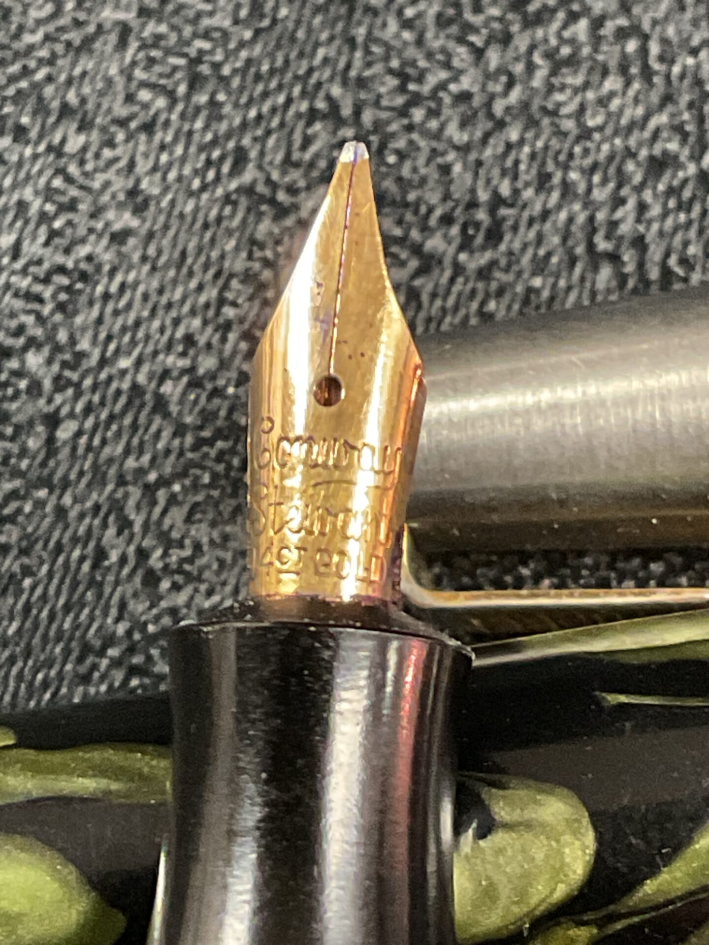 This lot comprises two vintage fountain pens: a Conway Stewart and a Parker. Both pens feature 14ct gold nibs, indicative of quality craftsmanship. The Conway Stewart exhibits a marbled green and black pattern, while the Parker pen is finished in a deep blue. These pens represent classic designs from renowned pen manufacturers.