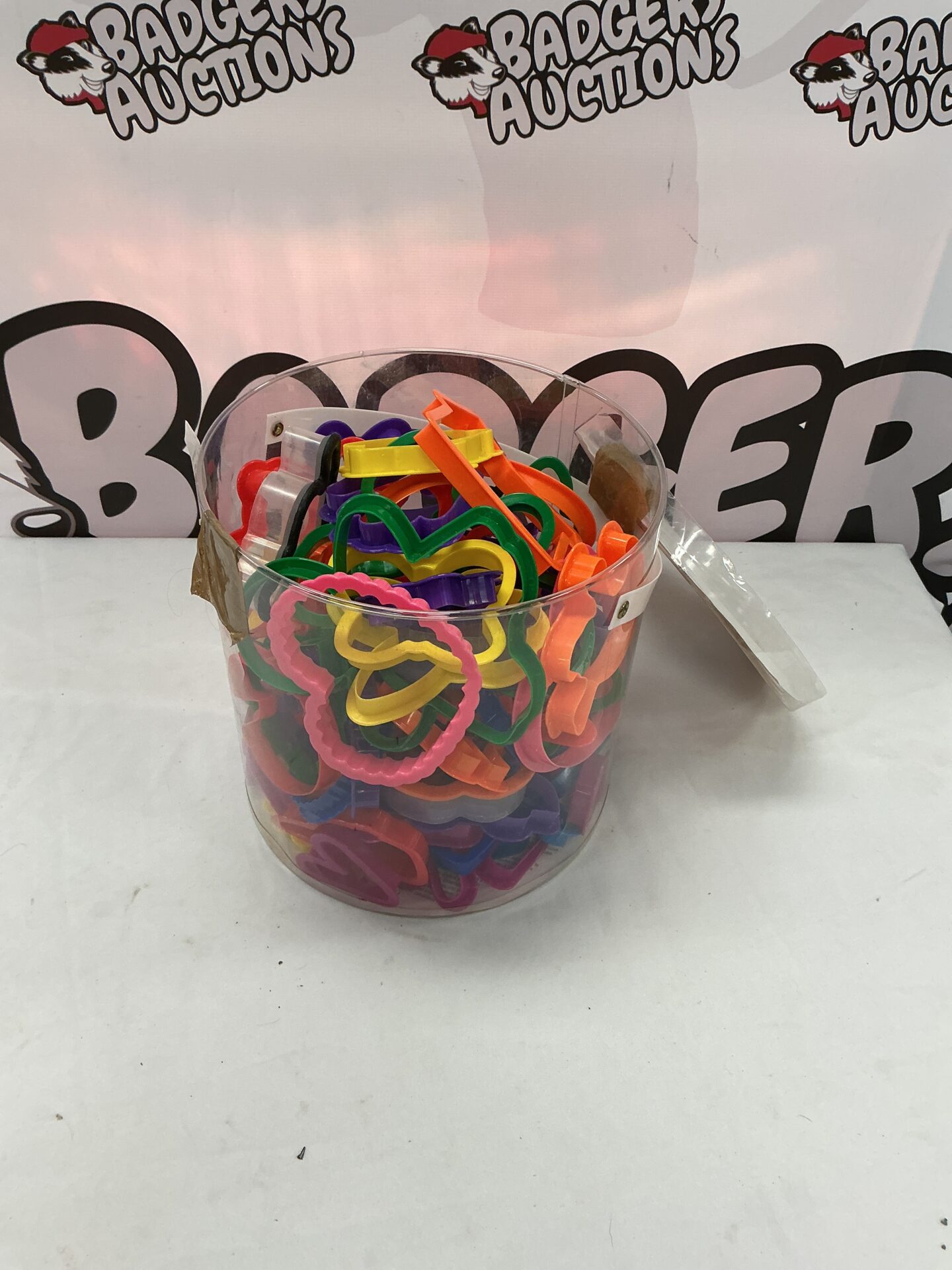 This lot features a collection of plastic cookie cutters in a variety of shapes and sizes. The cutters are contained within a clear plastic tub for easy storage and transport. This set is ideal for baking enthusiasts and those looking to add some fun to their kitchen.