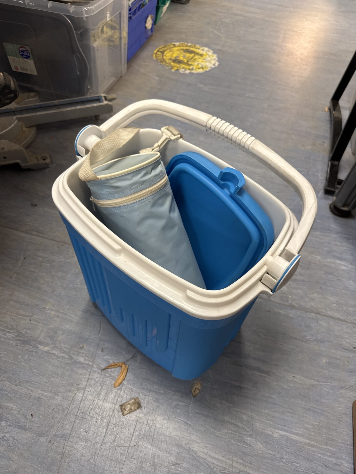 This set includes a bright blue plastic cooler box, perfect for picnics, camping, or keeping drinks cold at outdoor events. It features a sturdy carry handle for easy transportation and a secure latching lid. Included is a white bottle cooler bag designed to fit inside the cooler, providing extra insulation for individual bottles or cans.