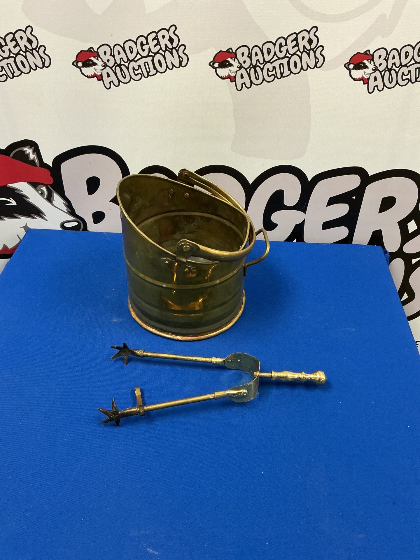 This copper coal bucket and tongs show signs of age and use, with some wear and patina consistent with its antique status. While not pristine, this adds to its character and authenticity. This set would be a welcome addition to a collector of antique fireplace accessories or a homeowner seeking to add a touch of vintage charm to their home.