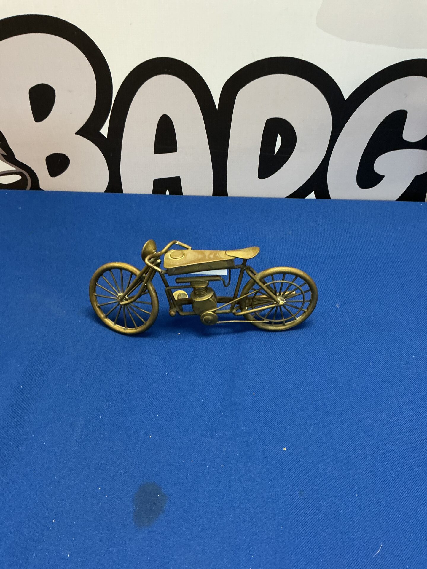 This copper motorcycle appears to be in excellent condition, with a rich patina that adds to its character. It is a collectible item that would appeal to motorcycle enthusiasts, steampunk aficionados, or anyone seeking a unique and eye-catching desk accessory. The sculpture is a testament to craftsmanship and would make a wonderful gift or addition to a personal collection.