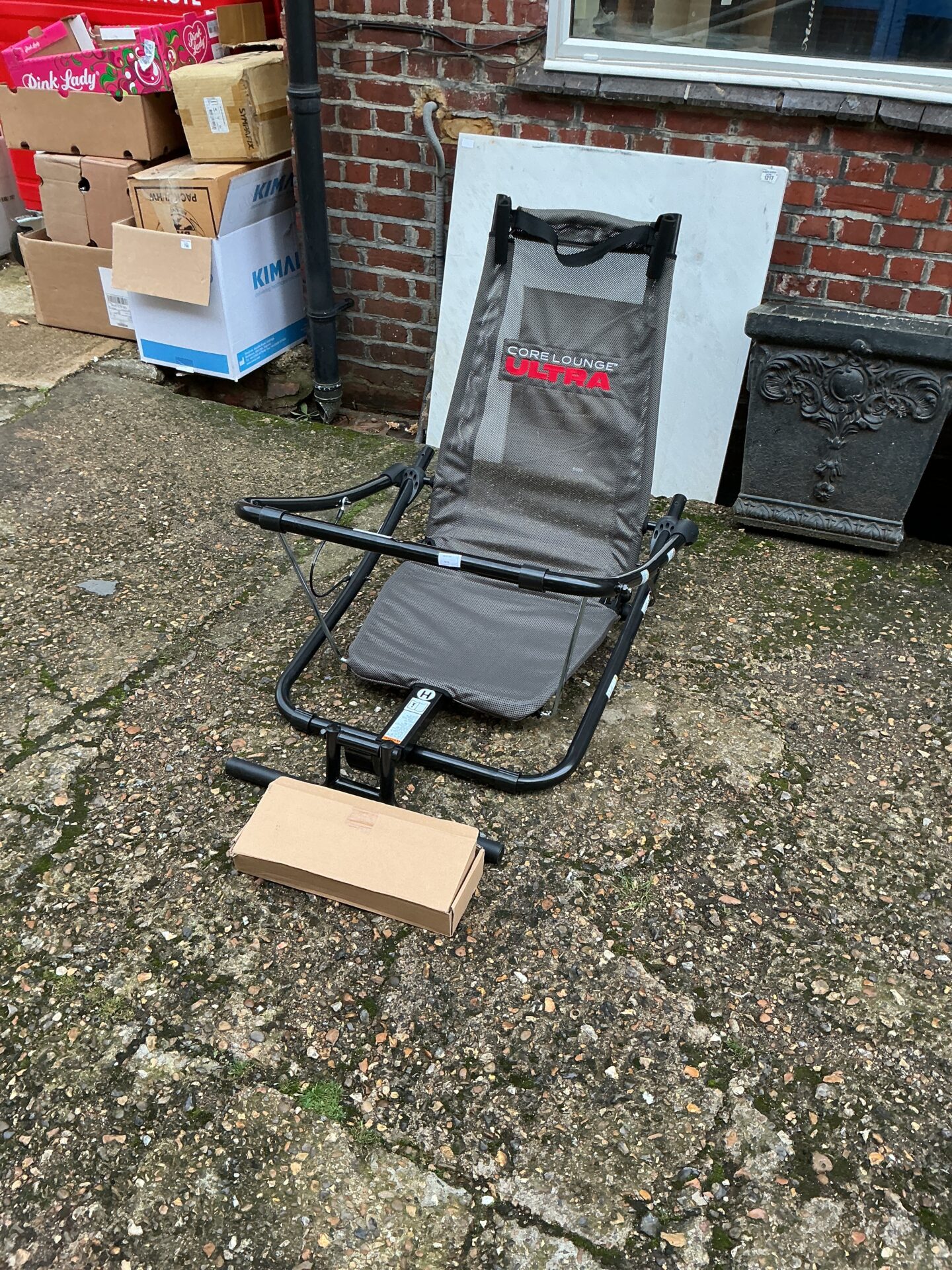 This is a Core Lounge Ultra Fitness Chair, designed for targeted core strengthening and exercise. The chair features a contoured seat and backrest, along with adjustable resistance bands for a customizable workout experience. Its compact design makes it suitable for home use, allowing for a variety of exercises to be performed in a limited space.