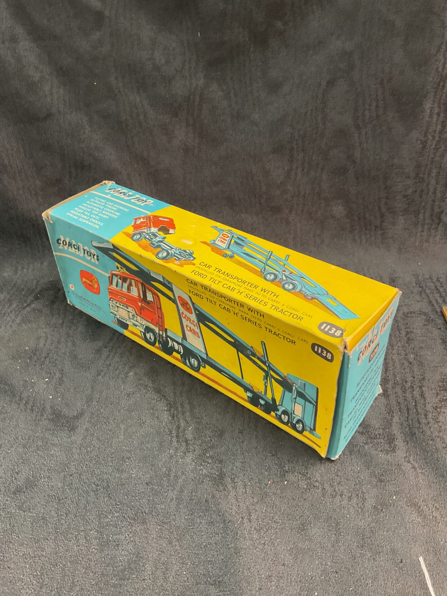 This is a vintage Corgi Toys Car Transporter with a Ford Tilt Cab H Series Tractor, model number 1138. The transporter features a red cab, silver trailer bed, and plastic loading ramps. It is designed to carry several miniature cars, and the trailer bed can tilt for easy loading and unloading. This model is a classic example of diecast toy vehicles from the mid-20th century, known for their attention to detail and quality construction.