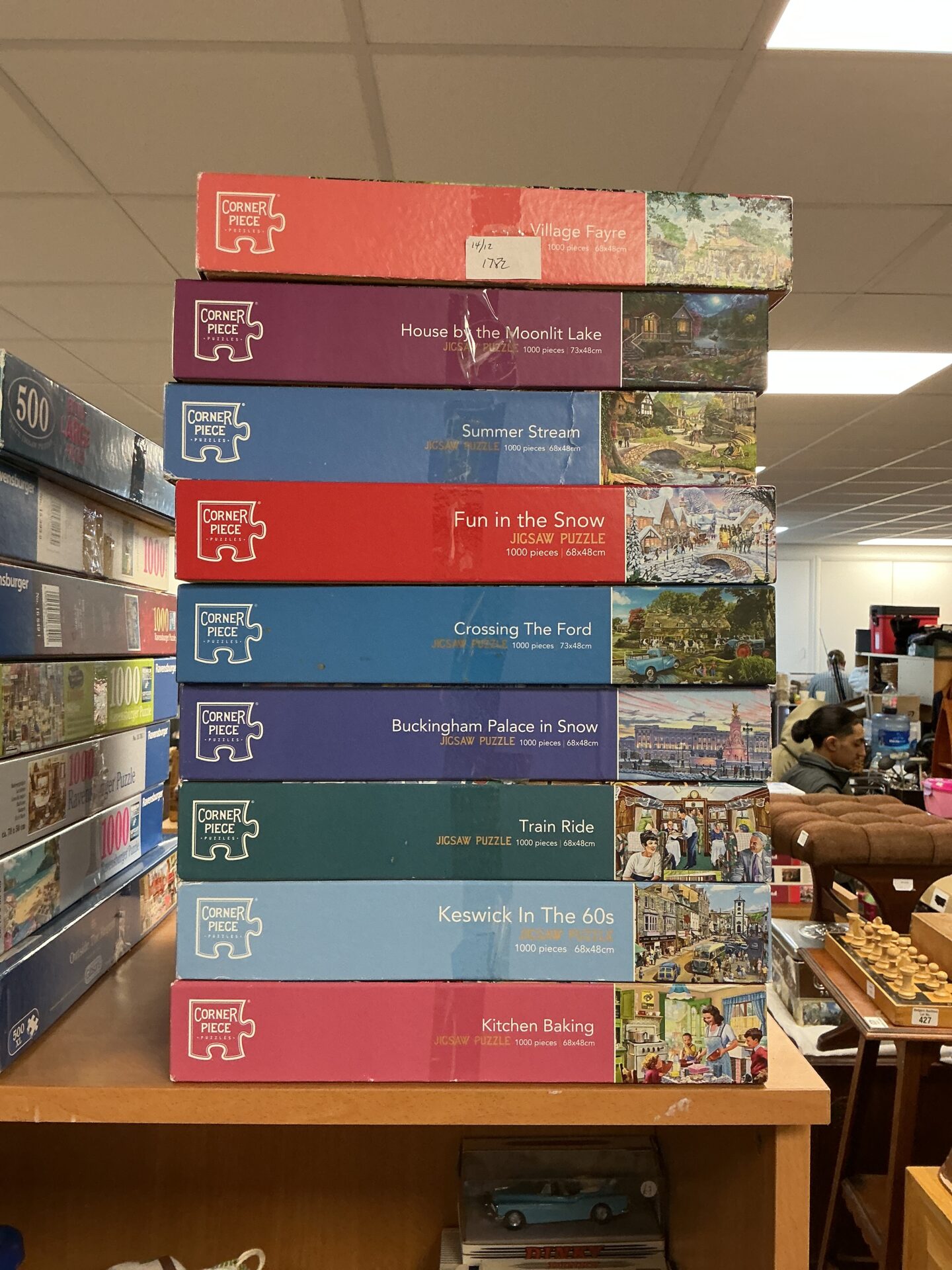 This lot comprises a collection of Corner Piece jigsaw puzzles, offering a variety of scenes and piece counts. The puzzles are presented in their original boxes, showcasing colourful imagery and indicating the number of pieces within each. This collection is ideal for puzzle enthusiasts or those seeking nostalgic boxed games.