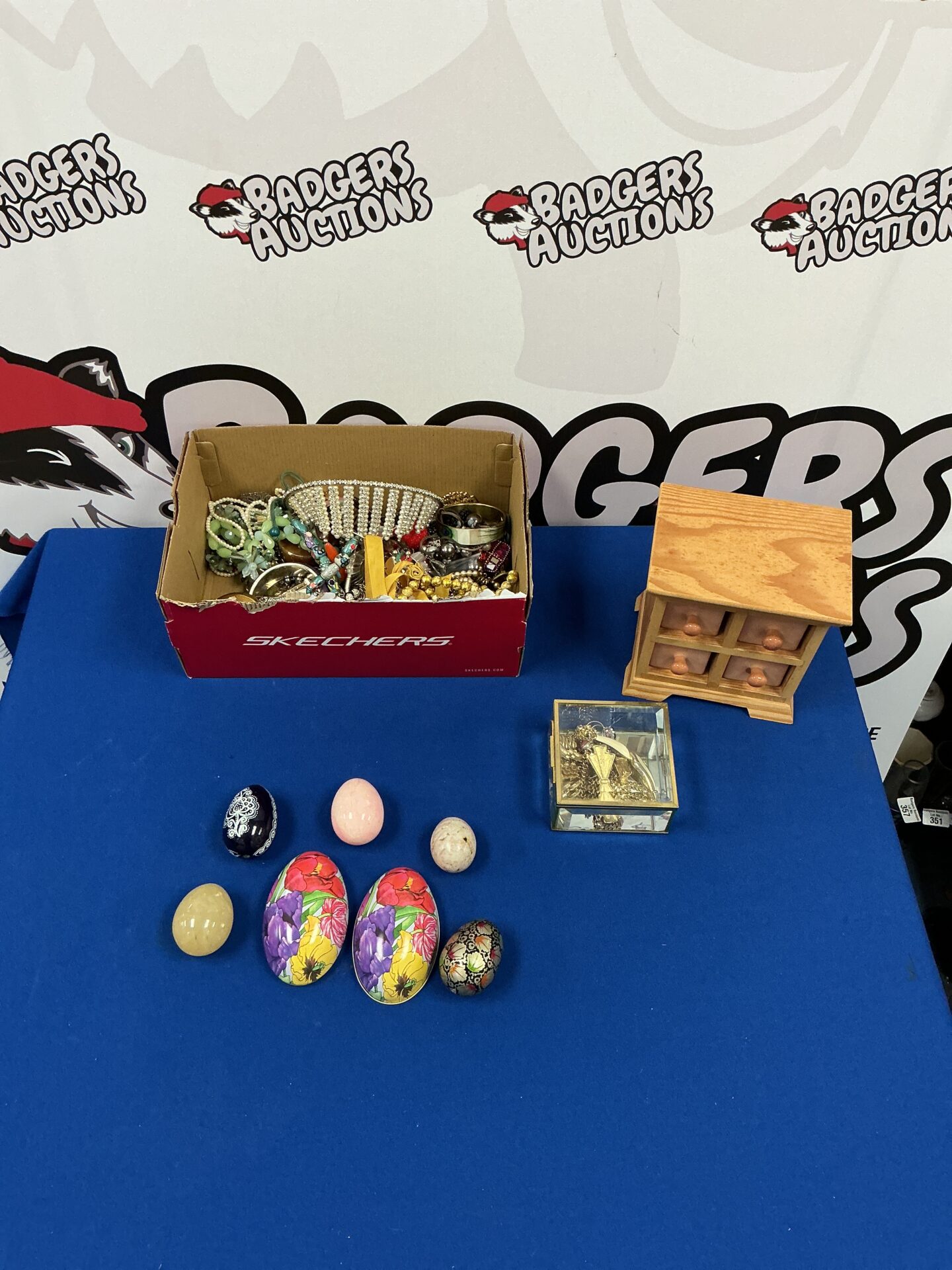 The jewellery and eggs are in generally good condition, with some pieces showing minor wear consistent with age and use. This lot presents a unique opportunity to acquire a varied collection of costume jewellery and decorative eggs, perfect for adding to an existing collection or for crafting projects. The mix of styles and colours makes this a versatile lot appealing to a wide range of buyers.