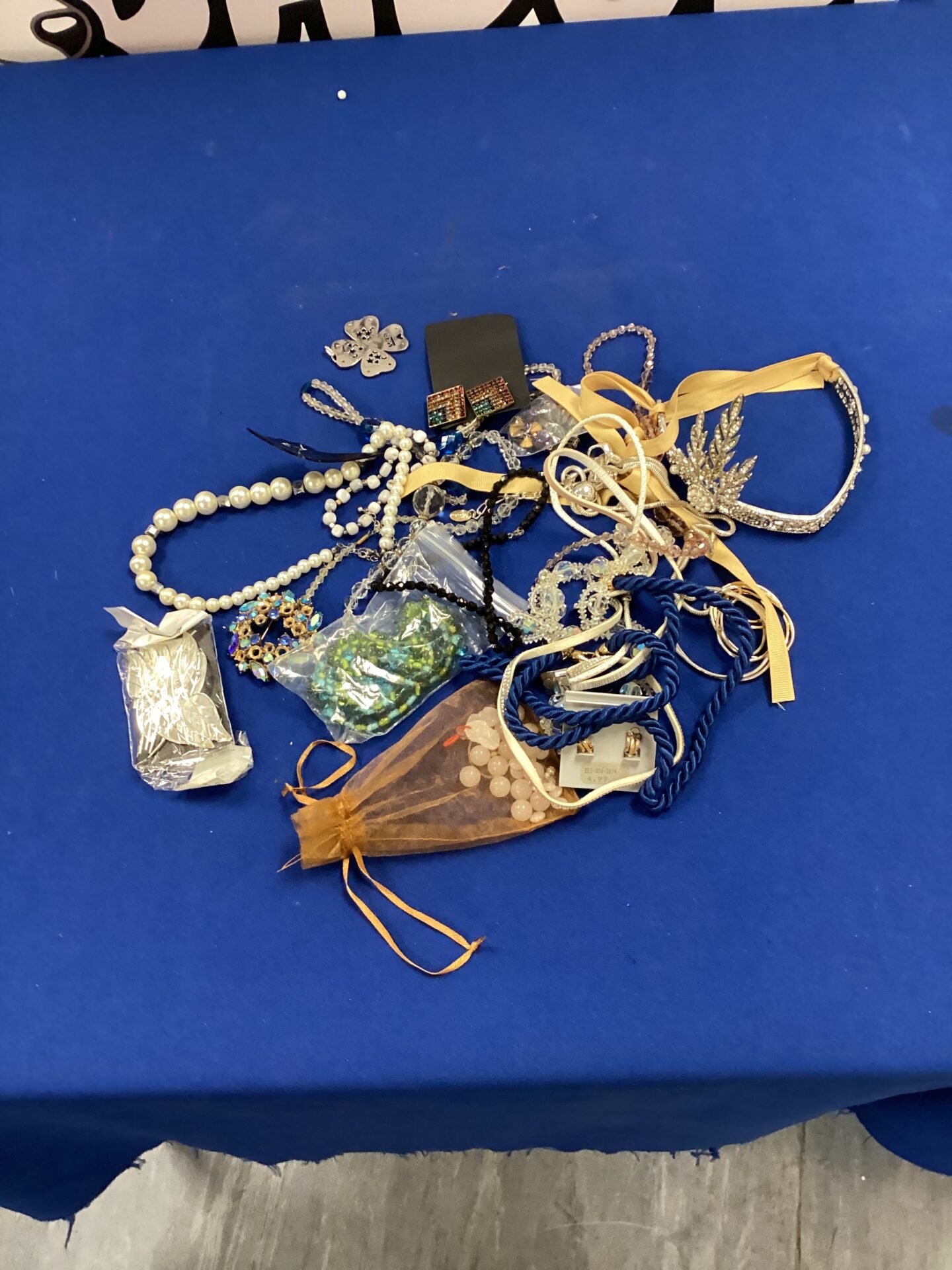 This is a mixed lot of costume jewellery, presented in a drawstring bag. The lot includes a variety of pieces, such as beaded necklaces, brooches, and other fashion jewellery items. The collection appears to be a mix of vintage and more contemporary pieces, offering a diverse range of styles and designs.