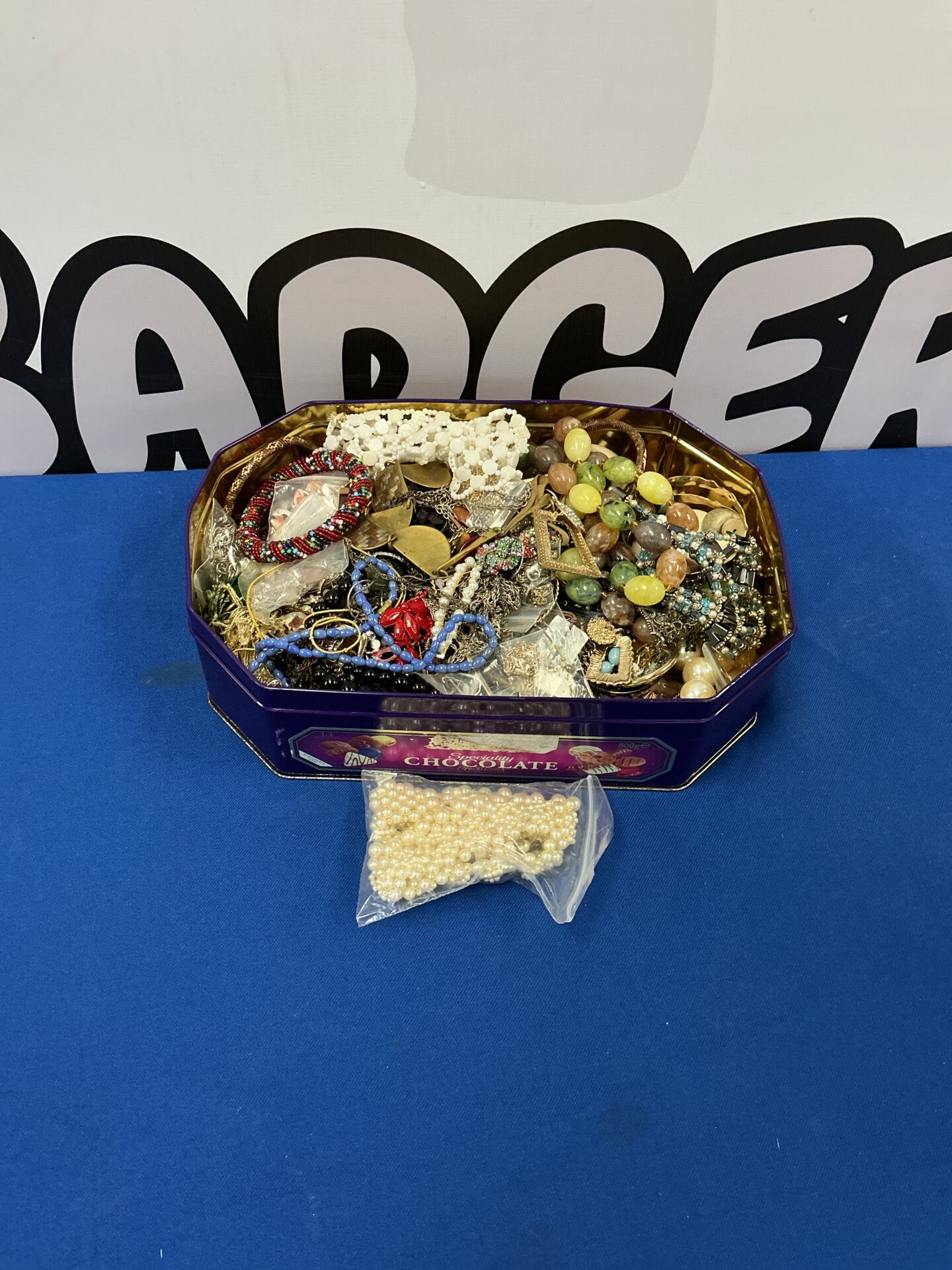 The jewellery appears to be in varied condition, with some pieces showing signs of wear consistent with age and use. While not assessed for individual hallmarks or precious materials, this lot offers a charming assortment for jewellery enthusiasts or those interested in vintage fashion. The tray presents an opportunity to repurpose components, create unique designs, or simply enjoy a colourful collection of costume jewellery.