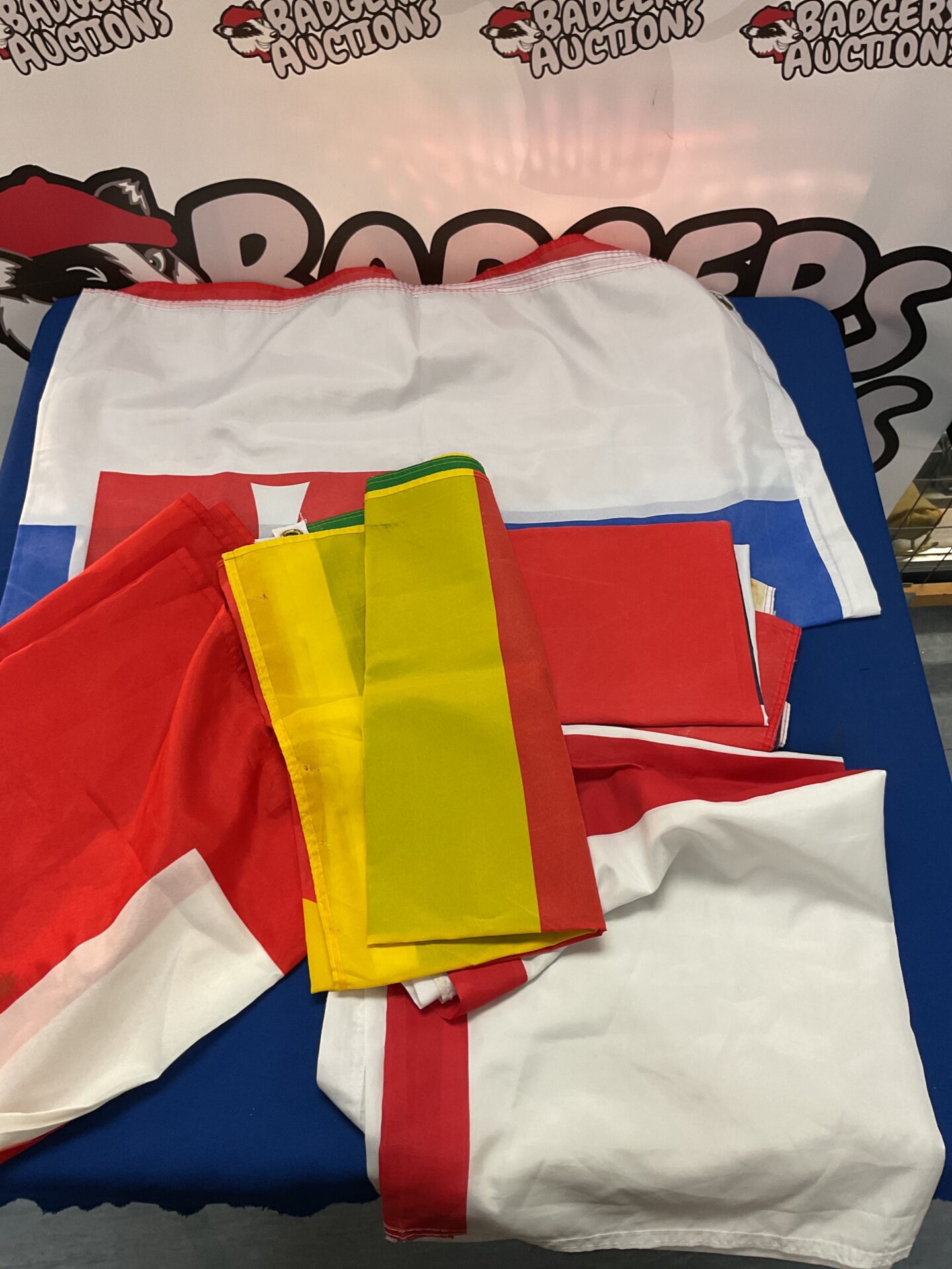 This lot comprises five country flags, each displaying distinct national colours and designs. The flags appear to be constructed from a lightweight polyester material, suitable for display or collection. The vibrant colours suggest these flags were intended for outdoor use, though their exact origin and purpose are unknown.