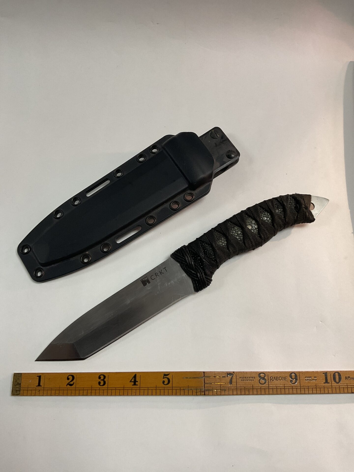 This CRKT fixed blade knife features a black coated blade and textured handle, ideal for tactical or outdoor use. It includes a black nylon sheath for secure carry. A robust and reliable tool for collectors and enthusiasts alike, this knife shows signs of use and wear.