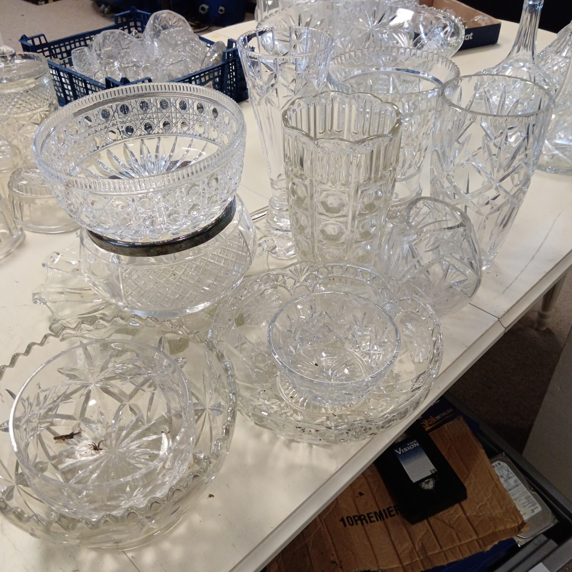 This lot comprises a selection of crystal and cut glass bowls and vases, showcasing intricate patterns and designs. The pieces exhibit a variety of shapes and sizes, suitable for display or use as decorative elements. The craftsmanship suggests a focus on quality and aesthetic appeal, typical of vintage glassware.