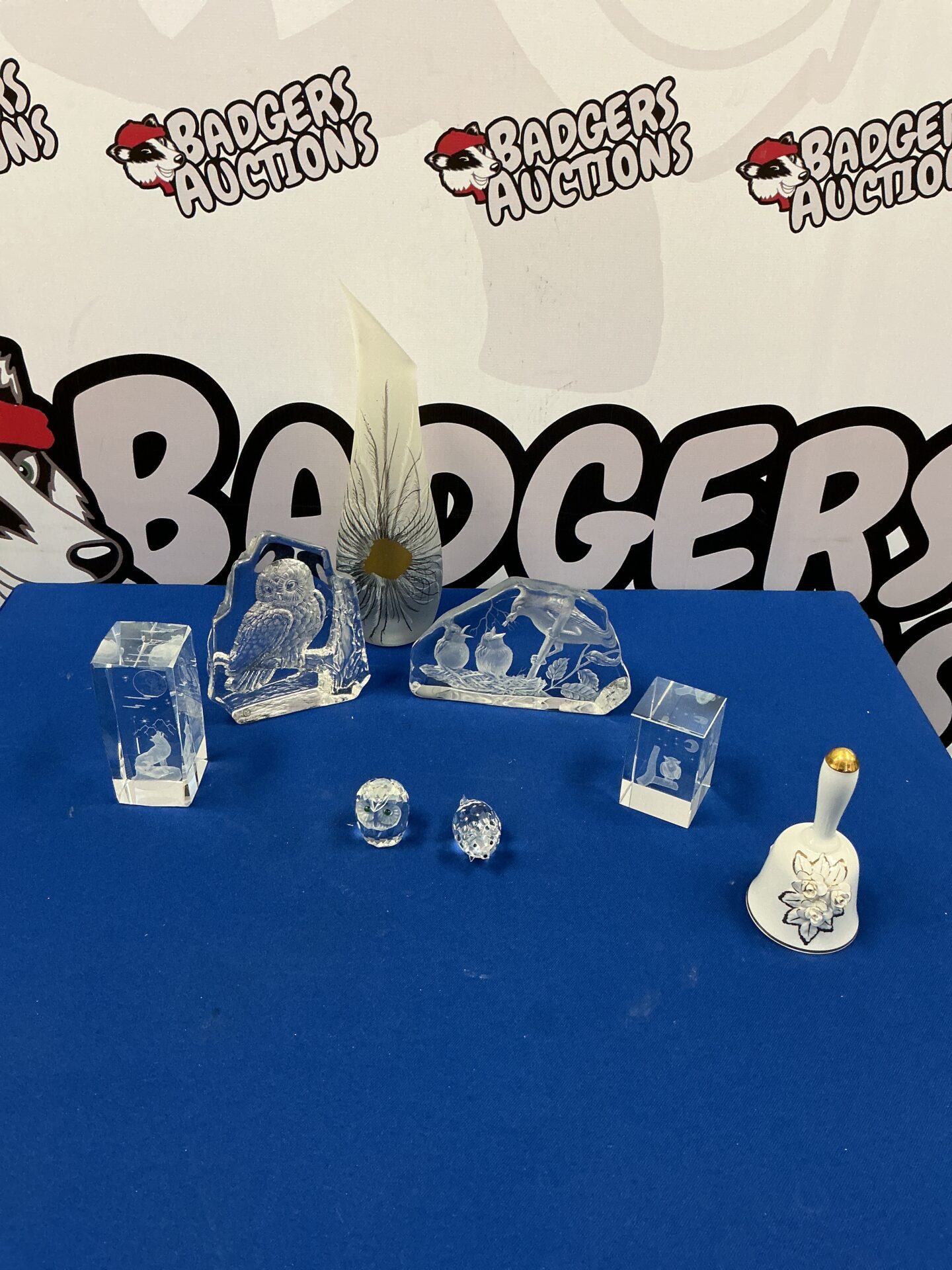 This is a collection of clear crystal and glass figurines and ornaments. The pieces feature intricate designs and are likely intended for display or decorative purposes. The collection appears to be well-maintained and offers a sparkling addition to any home decor.