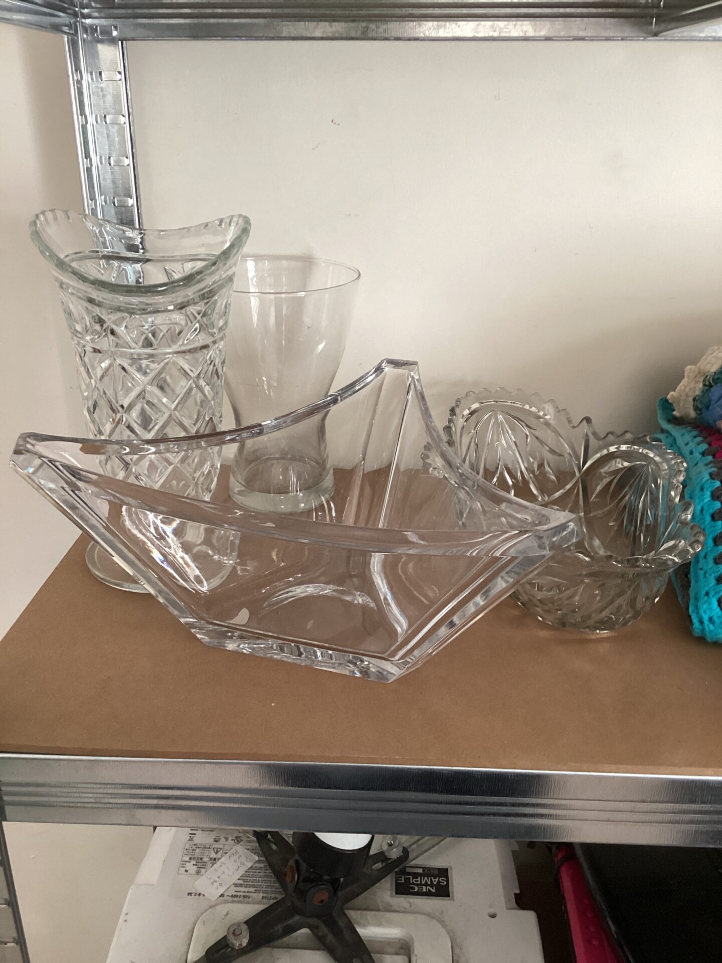 This lot comprises four pieces of clear crystal glass, including vases and bowls. The pieces exhibit intricate cut glass detailing, suggesting a vintage origin and a focus on decorative appeal. The varying shapes and sizes offer versatility for display or functional use, adding a touch of elegance to any setting.