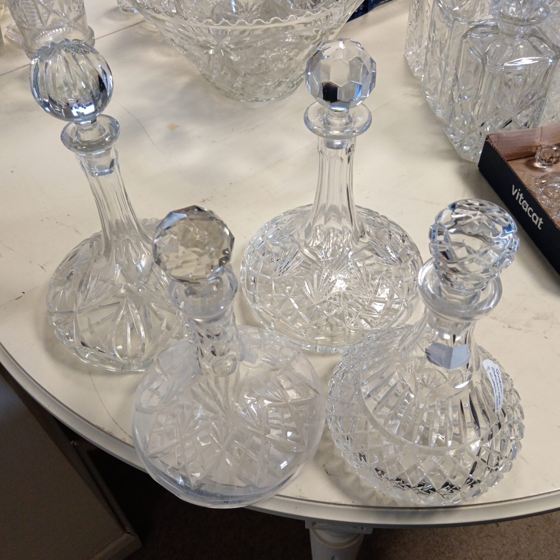 This lot comprises four beautifully crafted crystal ships decanters. Each decanter is designed with a classic ship-in-bottle aesthetic, featuring a detailed ship meticulously encased within clear crystal. The decanters exhibit intricate cuts and facets, enhancing their visual appeal and showcasing the craftsmanship involved in their creation. These decanters would have originally been used for serving spirits, adding a touch of nautical charm to any bar or dining setting.