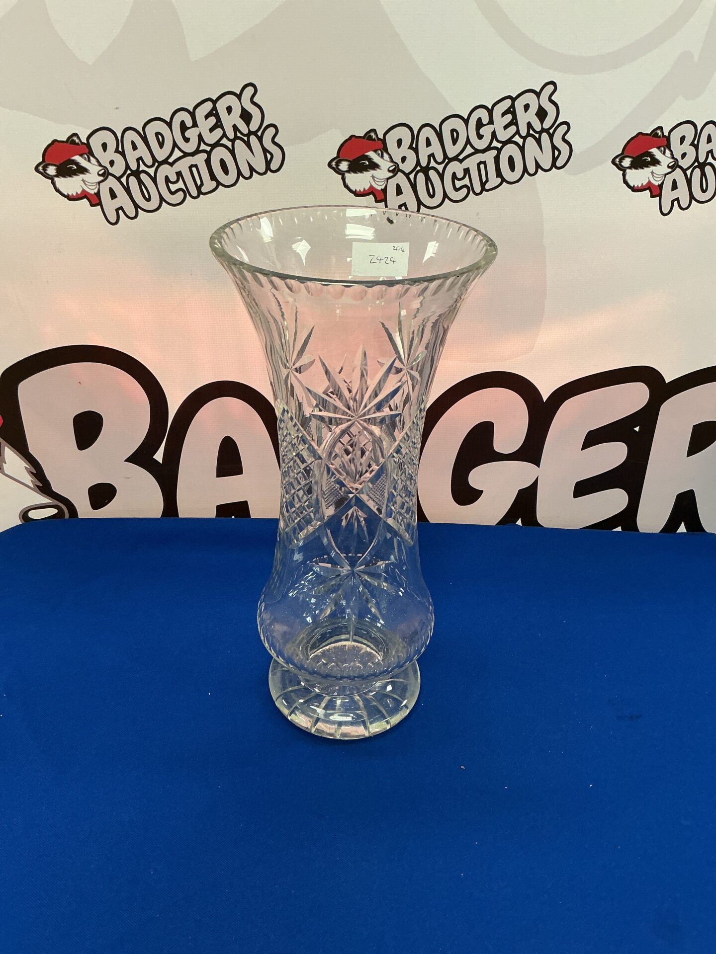 This stunning crystal vase stands 15 inches tall and showcases a beautifully cut design. The intricate patterns catch the light, creating a dazzling display. This vase is perfect for displaying fresh flowers or as a standalone decorative piece, adding a touch of sophistication to any room.