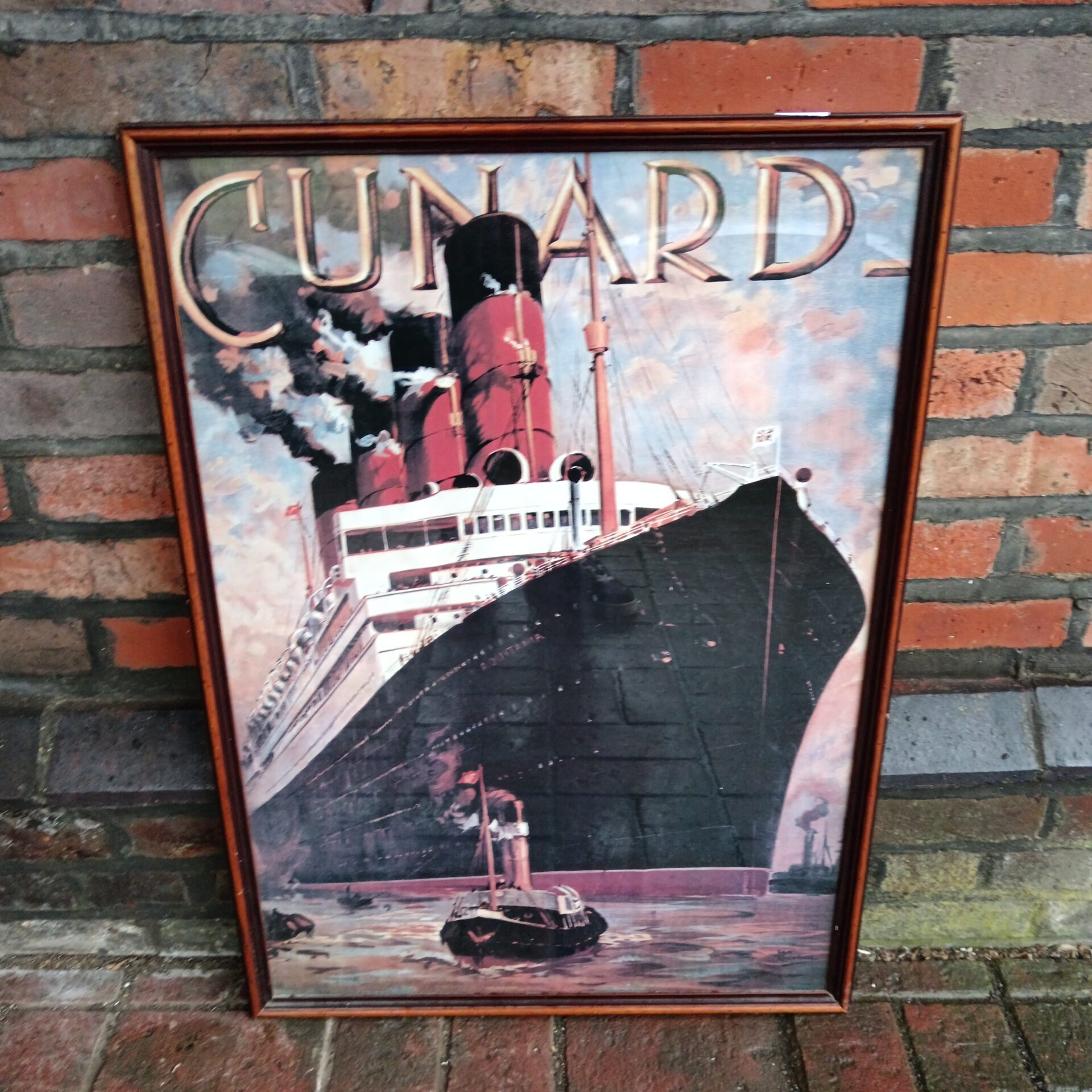 This is a large framed print depicting a classic Cunard steamship. The artwork showcases a detailed rendering of the vessel, likely from the mid-20th century, capturing the grandeur of ocean travel. The print is presented within a wooden frame, enhancing its vintage aesthetic and making it ready for display.