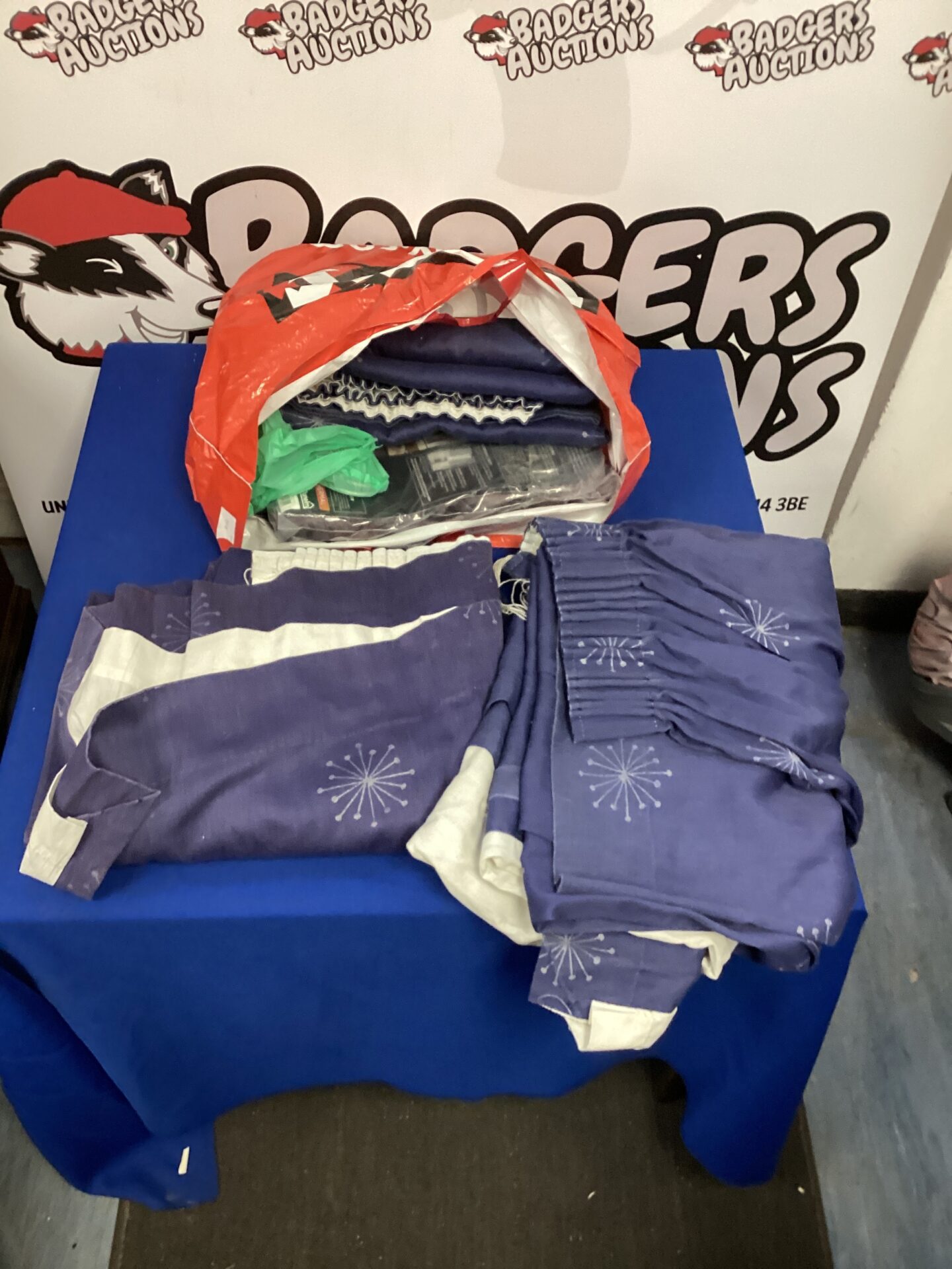 This lot includes a bag containing three sets of patterned curtains, perfect for adding a touch of style to any room. These window treatments are in good condition and ready to be used or displayed. A great find for those looking to refresh their home decor or collectors of vintage textiles.