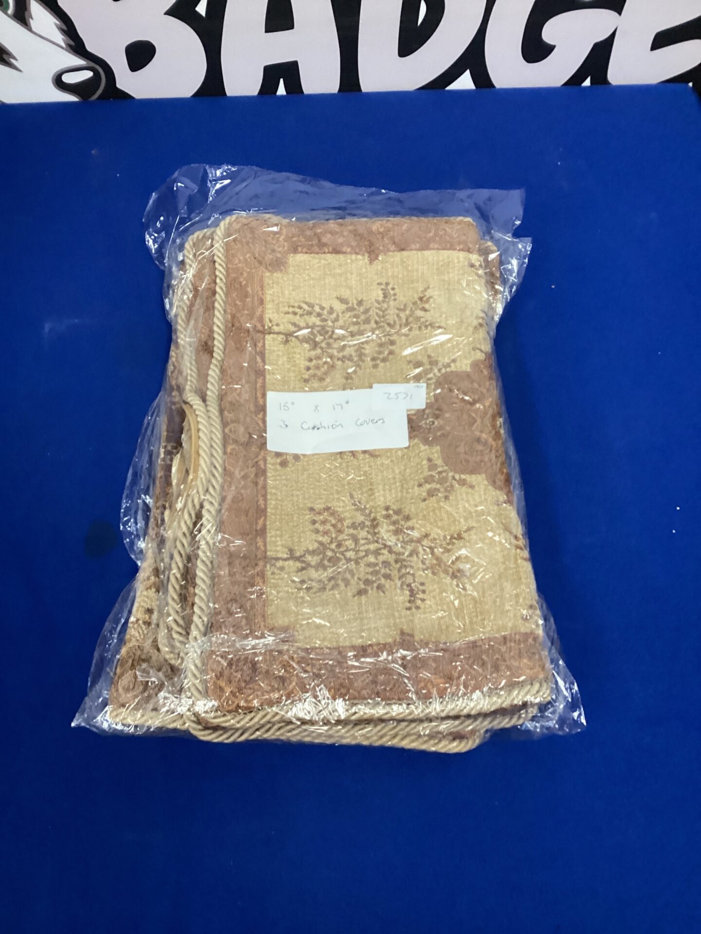 This is a set of three cushion covers, each measuring 15” x 17”. The covers feature a warm, earthy colour palette with a subtle patterned design. They appear to be made from a durable, textured fabric, suitable for adding a touch of comfort and style to any living space.
