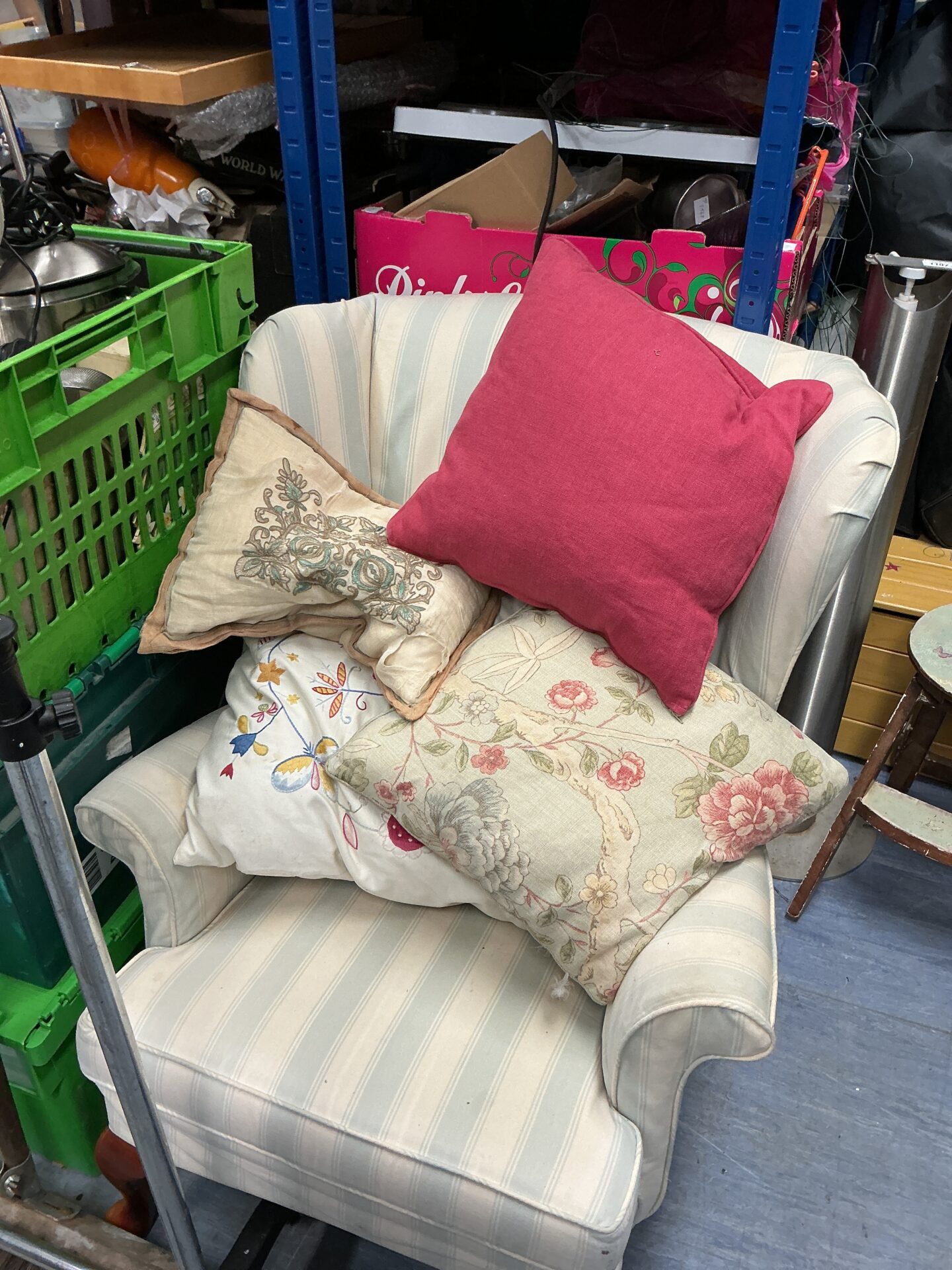 This lot features a comfortable armchair accompanied by four soft cushions. The chair has a classic shape with gently sloping arms and a padded seat, suggesting a focus on comfort. The cushions are decorated with a vibrant floral pattern, adding a touch of colour and character to the set.