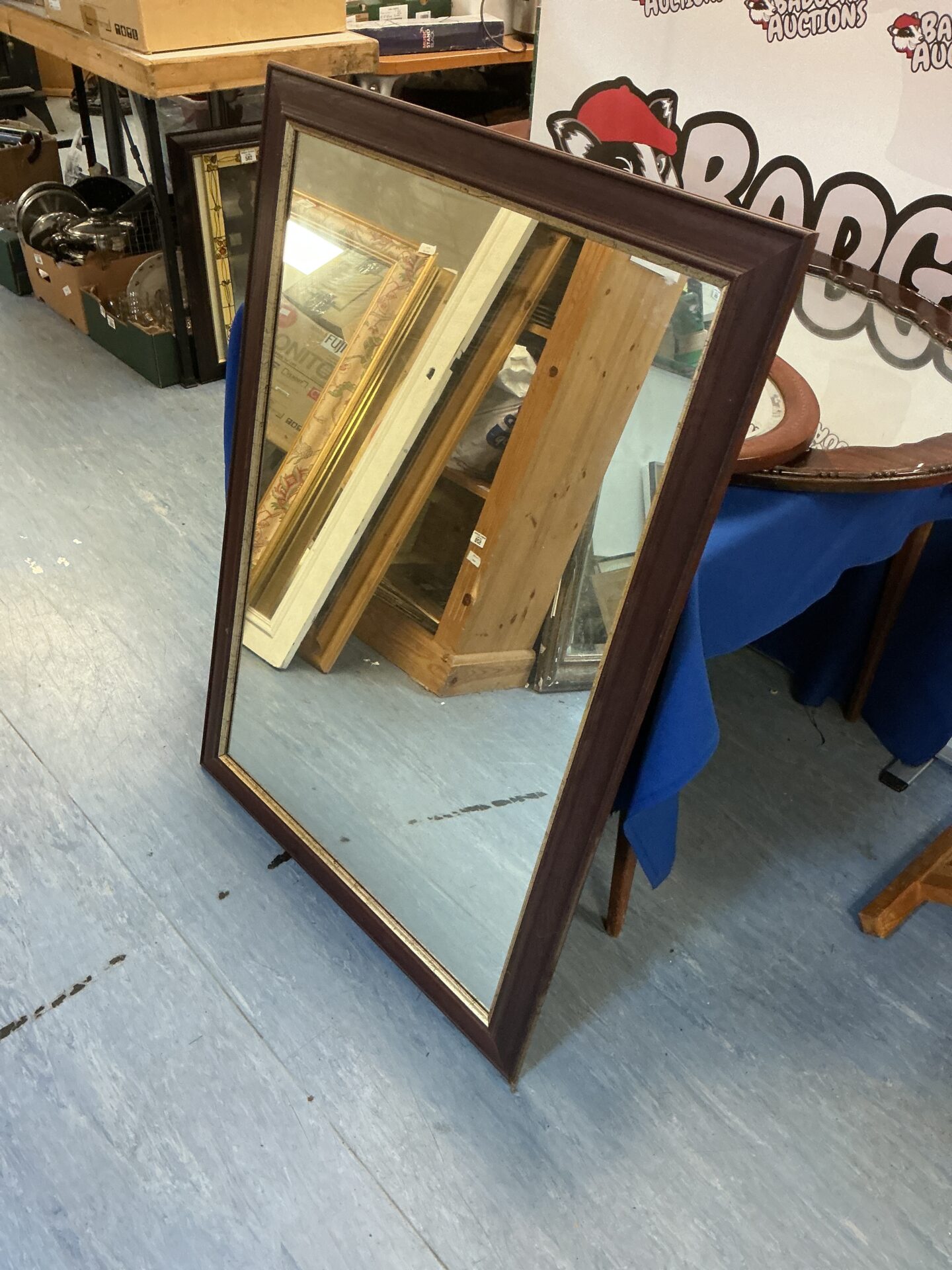 This is a dark wood framed mirror, measuring 41”x29”. The frame exhibits a classic design, suggesting a vintage or antique origin. The mirror itself is likely silvered glass, offering a clear reflection and adding a touch of elegance to any room.