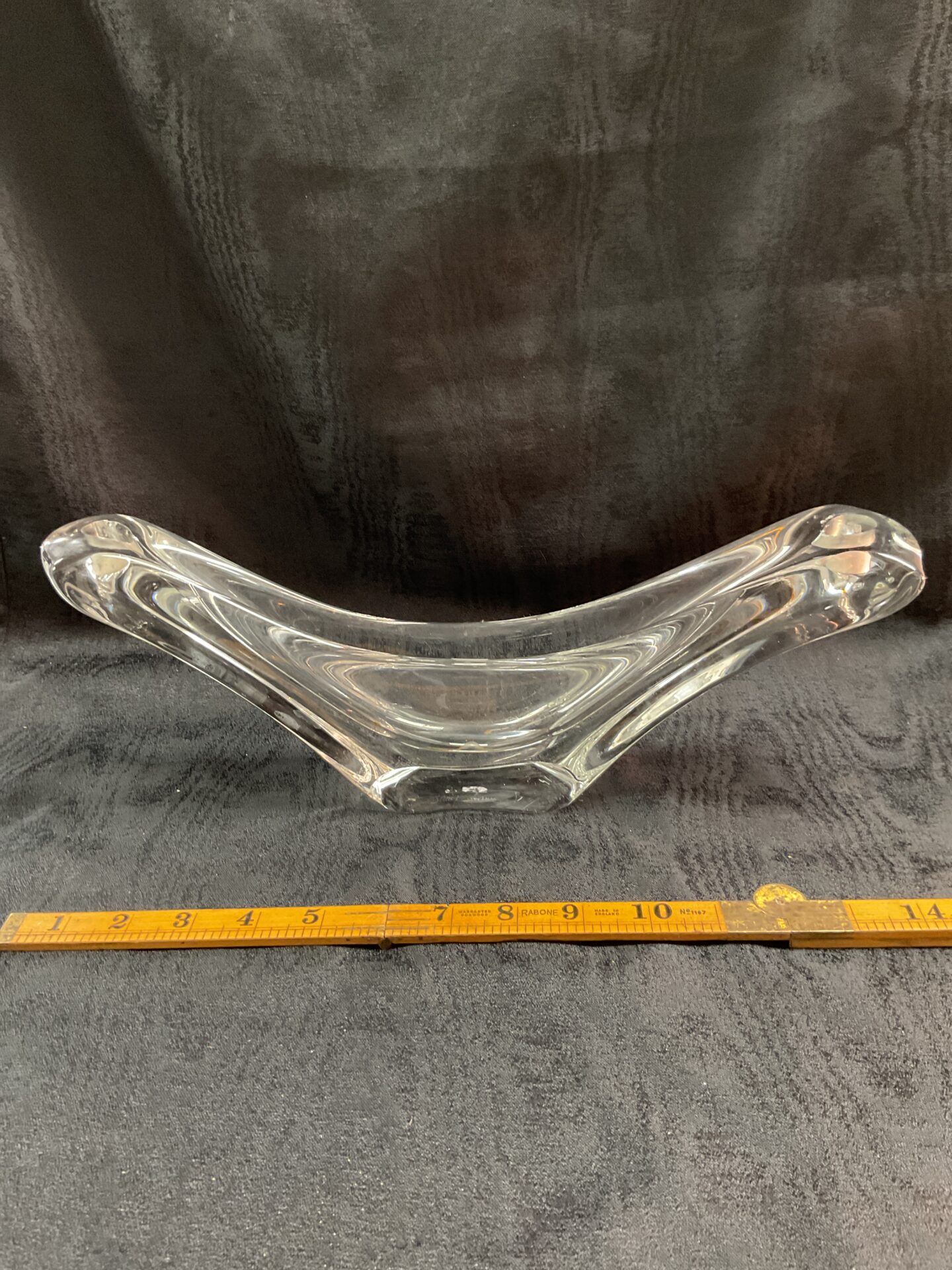 This exquisite centrepiece is crafted from clear crystal by Daum France, renowned for their exceptional artistry in glassmaking. The bowl features a distinctive swallowtail design, with elegantly curved edges that create a dynamic and visually appealing form. This piece exemplifies the mid-century modern aesthetic, showcasing a blend of organic shapes and refined craftsmanship. It’s a stunning example of French art glass, designed to be a focal point in any setting.