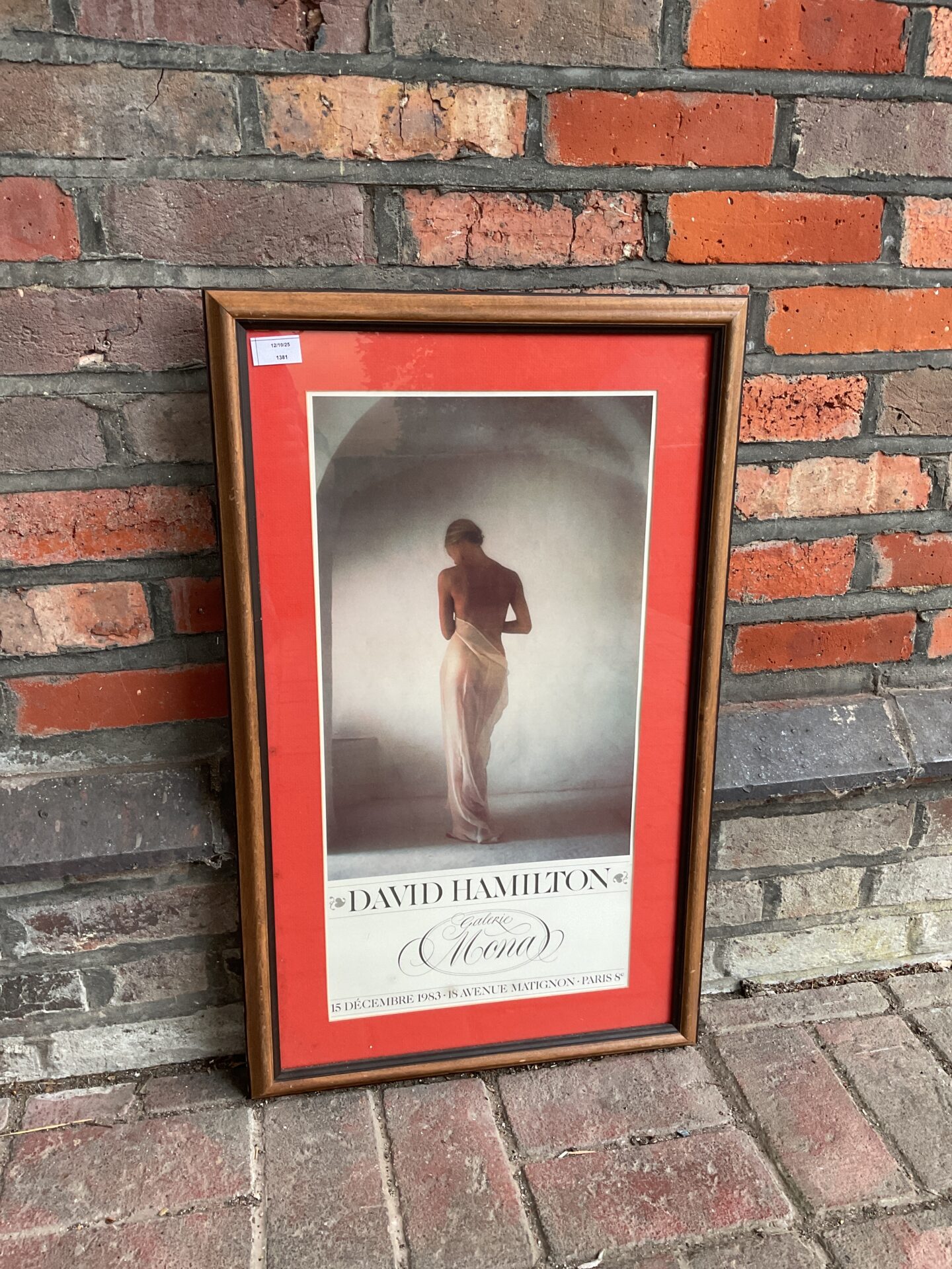 This is a striking black and white print by renowned French photographer David Hamilton, depicting a semi-clad woman in a classic, artistic pose. The print originates from the Galerie Mona, known for showcasing evocative and often minimalist photographic works. The image captures a sense of intimacy and artistic expression, typical of Hamilton’s style, and is a beautiful example of 20th-century photographic art.