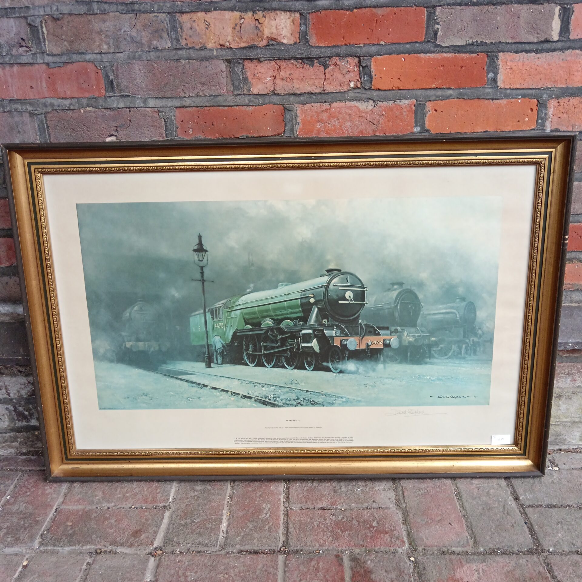 This is a signed, limited edition print of the Flying Scotsman by David Shepherd. The artwork beautifully captures the iconic steam locomotive in motion. A must-have for railway enthusiasts and art collectors, this print is professionally mounted and framed.
