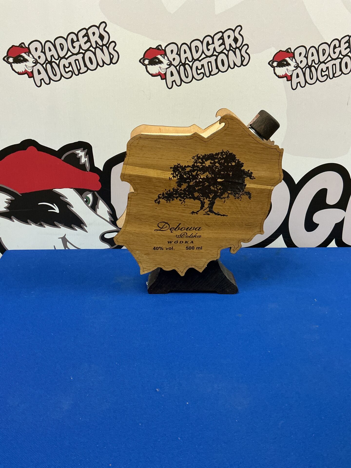 This is a sealed decanter of Debowa Polish Vodka. The decanter features a unique design, likely intended for display as well as serving. The bottle’s shape and detailing suggest a focus on presentation, making it a potential centerpiece for a home bar or a collector’s display.