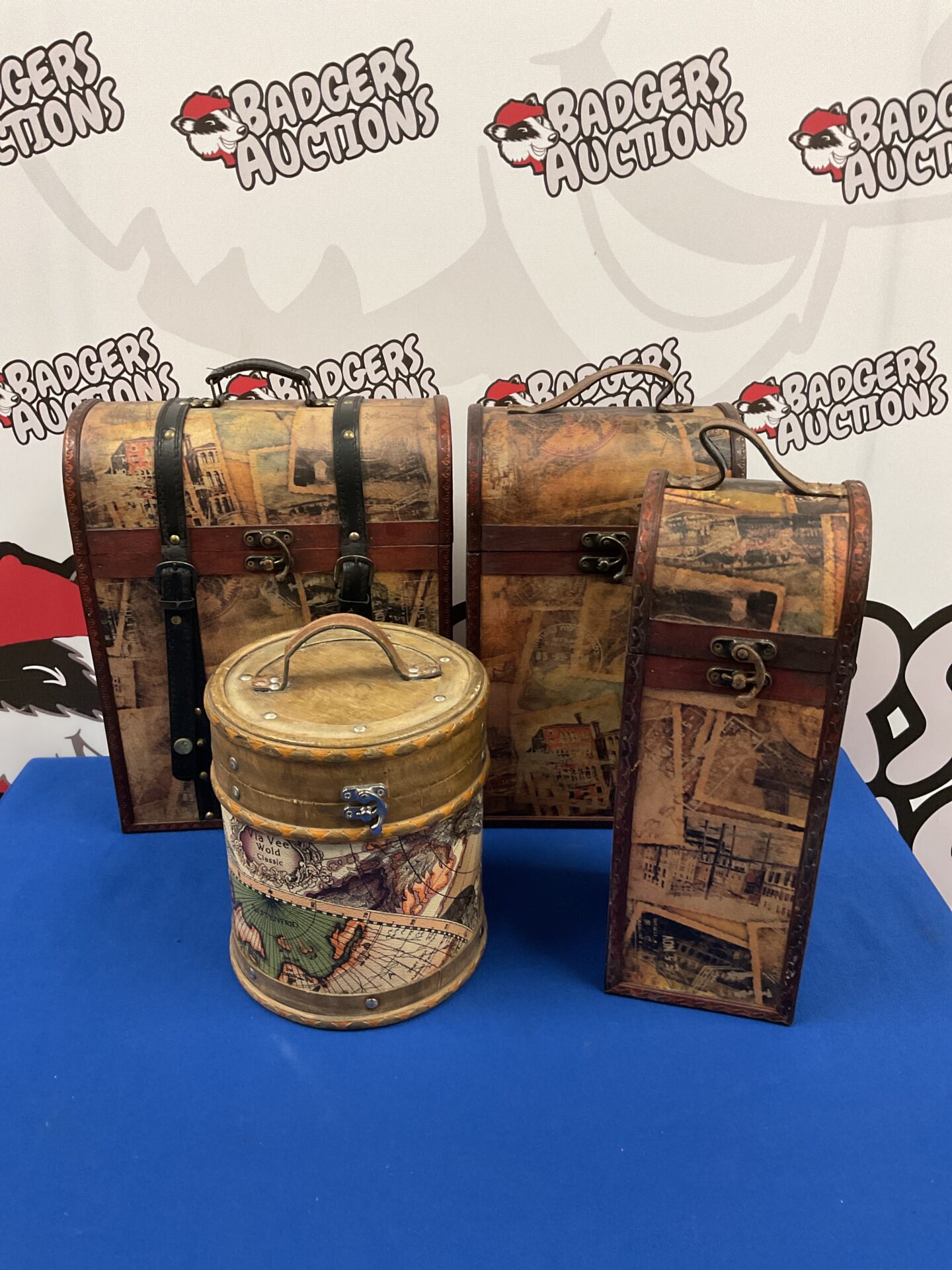 This lot comprises four decorative wooden wine boxes, each uniquely adorned with vintage-style map illustrations. These boxes are constructed from wood and feature a hinged lid, offering both aesthetic appeal and practical storage. The map designs evoke a sense of travel and exploration, making them ideal for display or as a charming addition to a wine-themed collection.