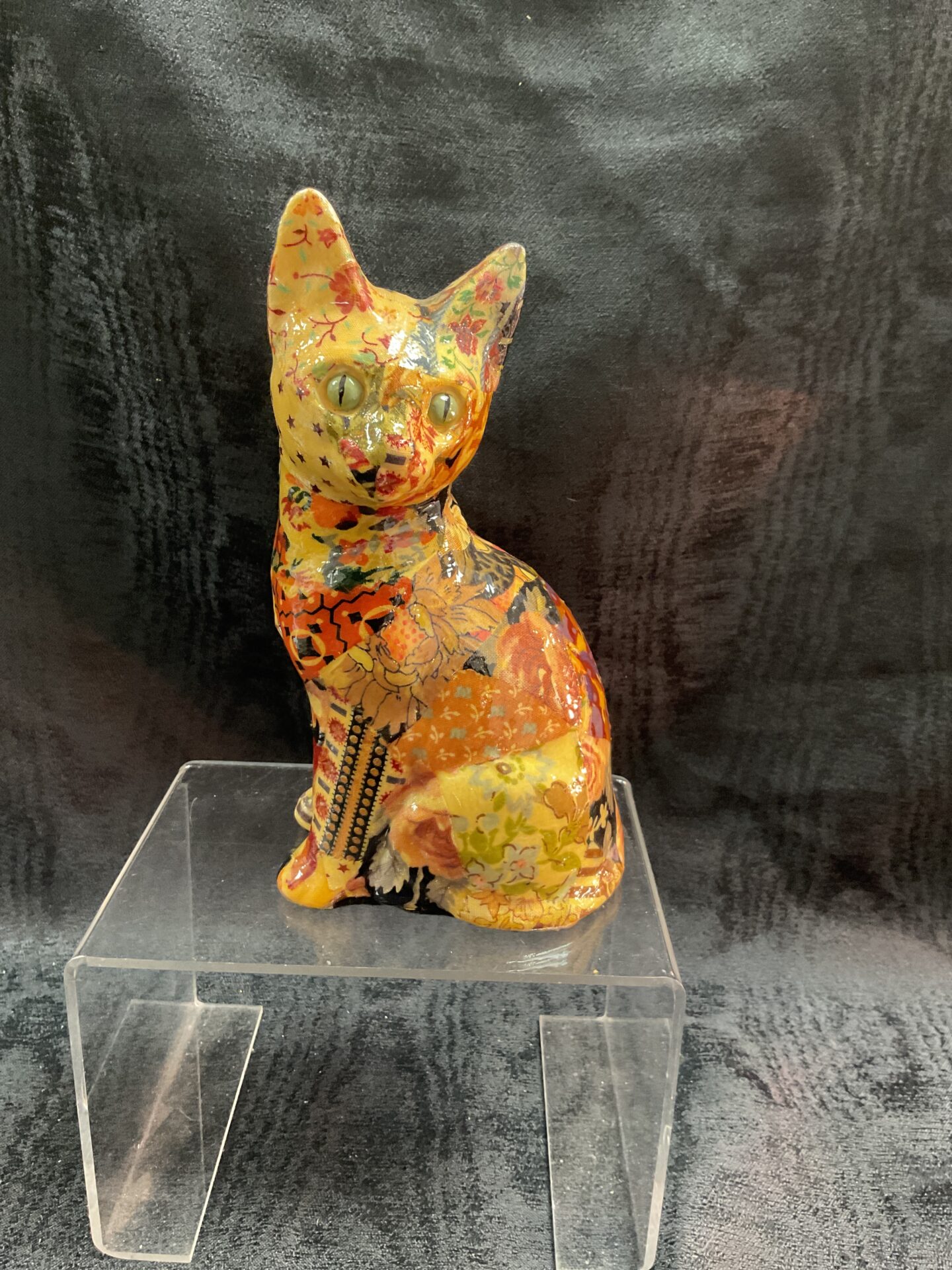 This is a charming decoupage cat figurine, approximately seven inches in height. The cat is adorned with a vibrant, colourful collage of patterned papers, meticulously applied and sealed to create a unique and eye-catching art object. The style is whimsical and folk art inspired, making it a delightful addition to any collection or home decor scheme.