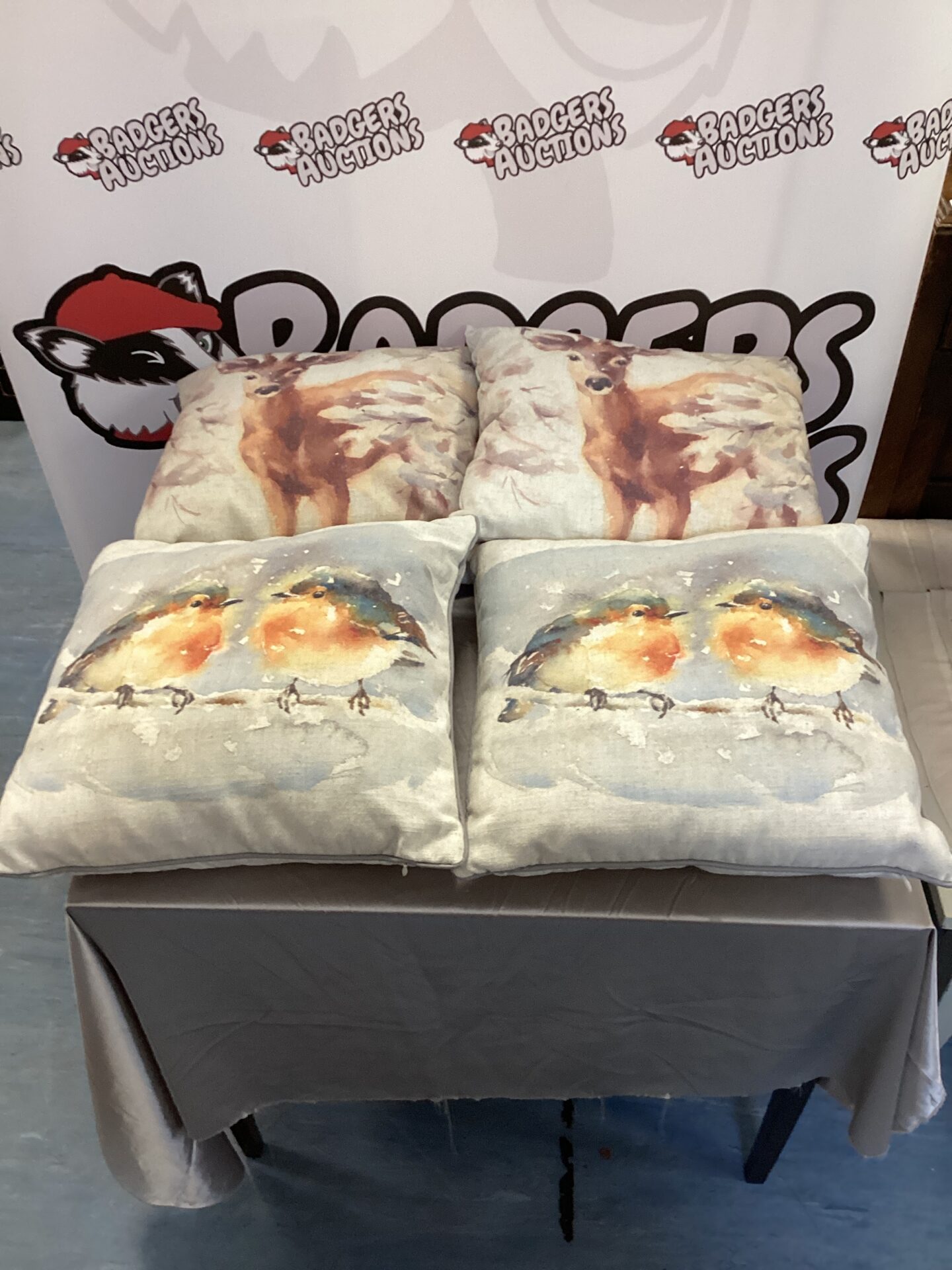 This is a set of four decorative cushions featuring a charming woodland design. Each cushion showcases a detailed print of deer and robins, creating a cosy and inviting atmosphere. The cushions are designed to complement a range of interior styles, particularly those with a country or rustic aesthetic.
