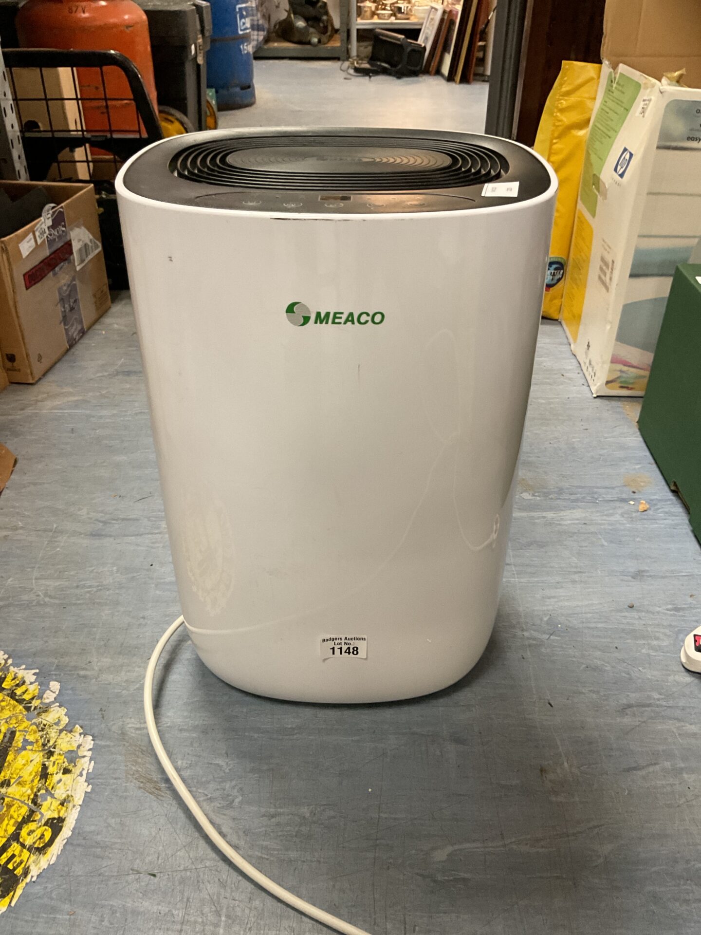 This is a white Meaco ABC 12L compressor dehumidifier. It is designed to remove excess moisture from the air, making it suitable for use in homes, basements, or other spaces prone to dampness. The unit features a compressor for efficient operation and is portable, allowing for flexible placement where it is most needed.