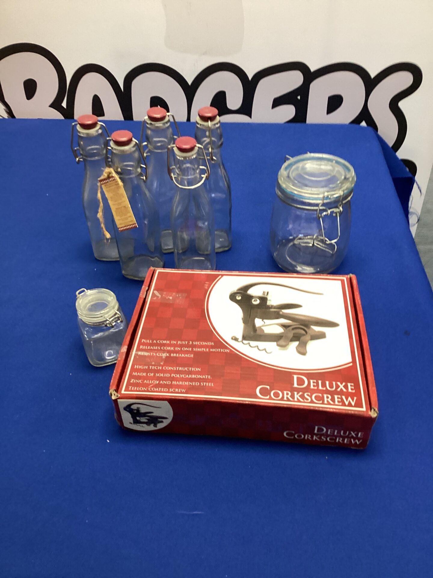 This set features a deluxe corkscrew, designed for ease of use and efficient bottle opening. The corkscrew appears to be new in packaging, suggesting it has been carefully stored. Included are several Kilner-style bottles and jars, known for their airtight seals and classic design, ideal for preserving homemade goods or beverages.