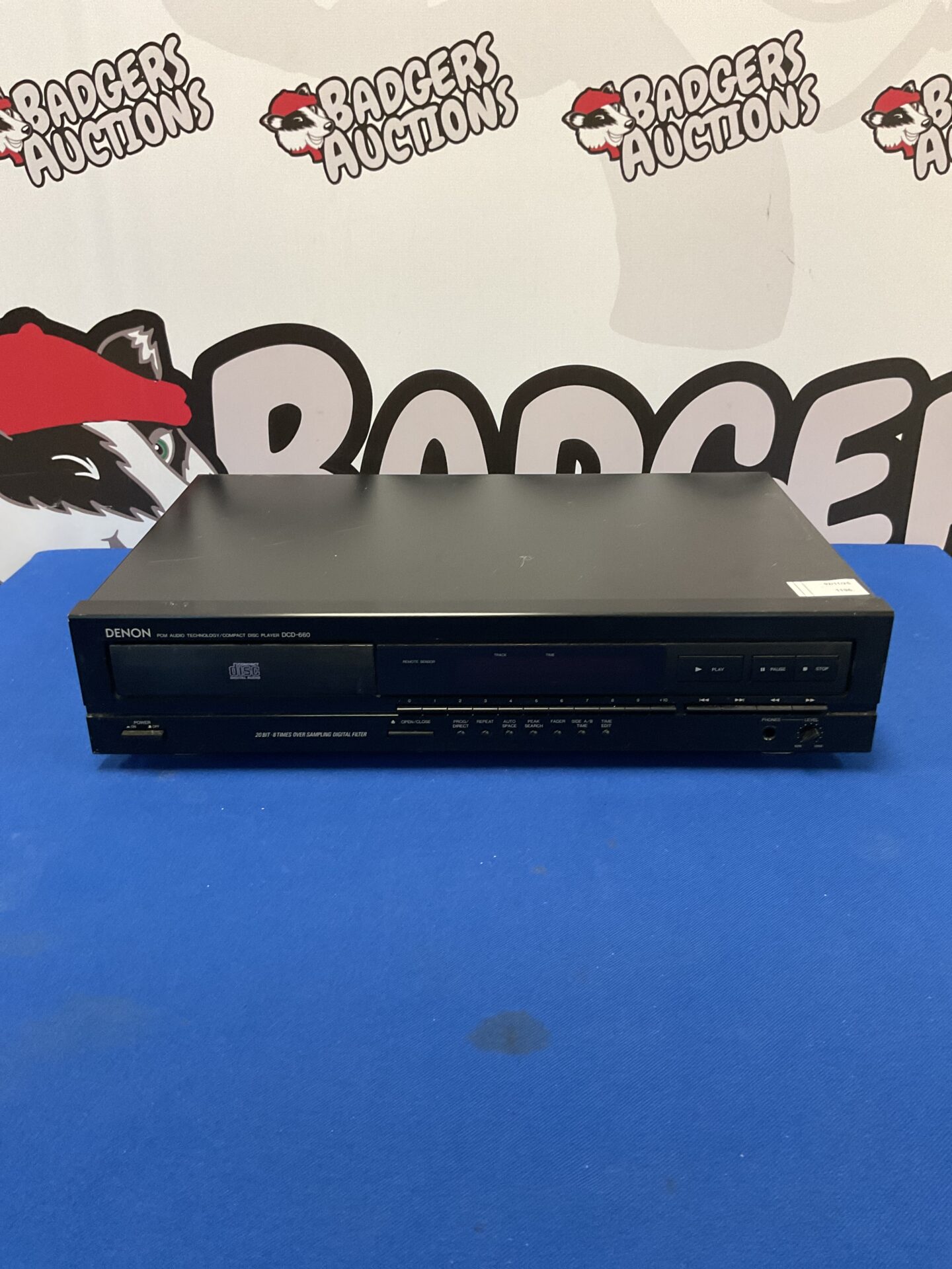 This is a Denon DCD-660 CD player, a component of a classic hi-fi system. It features Denon’s PCM audio technology, designed to deliver high-quality sound reproduction from compact discs. The player has a sleek, black finish and a functional layout with buttons for playback control, track selection, and other features.