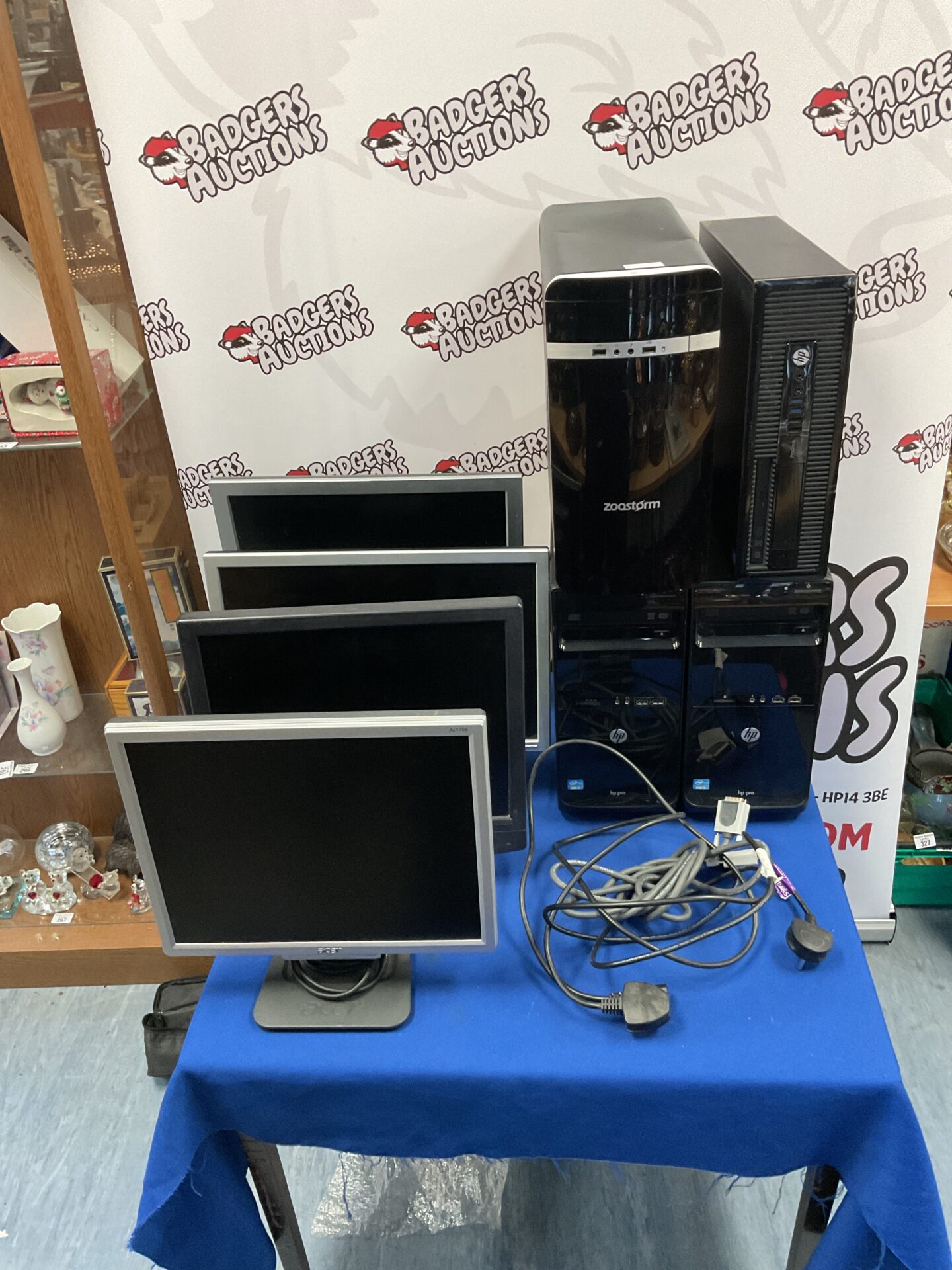 This lot comprises a selection of desktop computers including two HP Pro PCs, a HP ProDesk PC, and a ZooStorm PC. Included are four monitors, featuring brands such as Acer and Dell, offering a complete setup for various computing needs. The variety of brands and models suggests potential for repurposing or component harvesting.