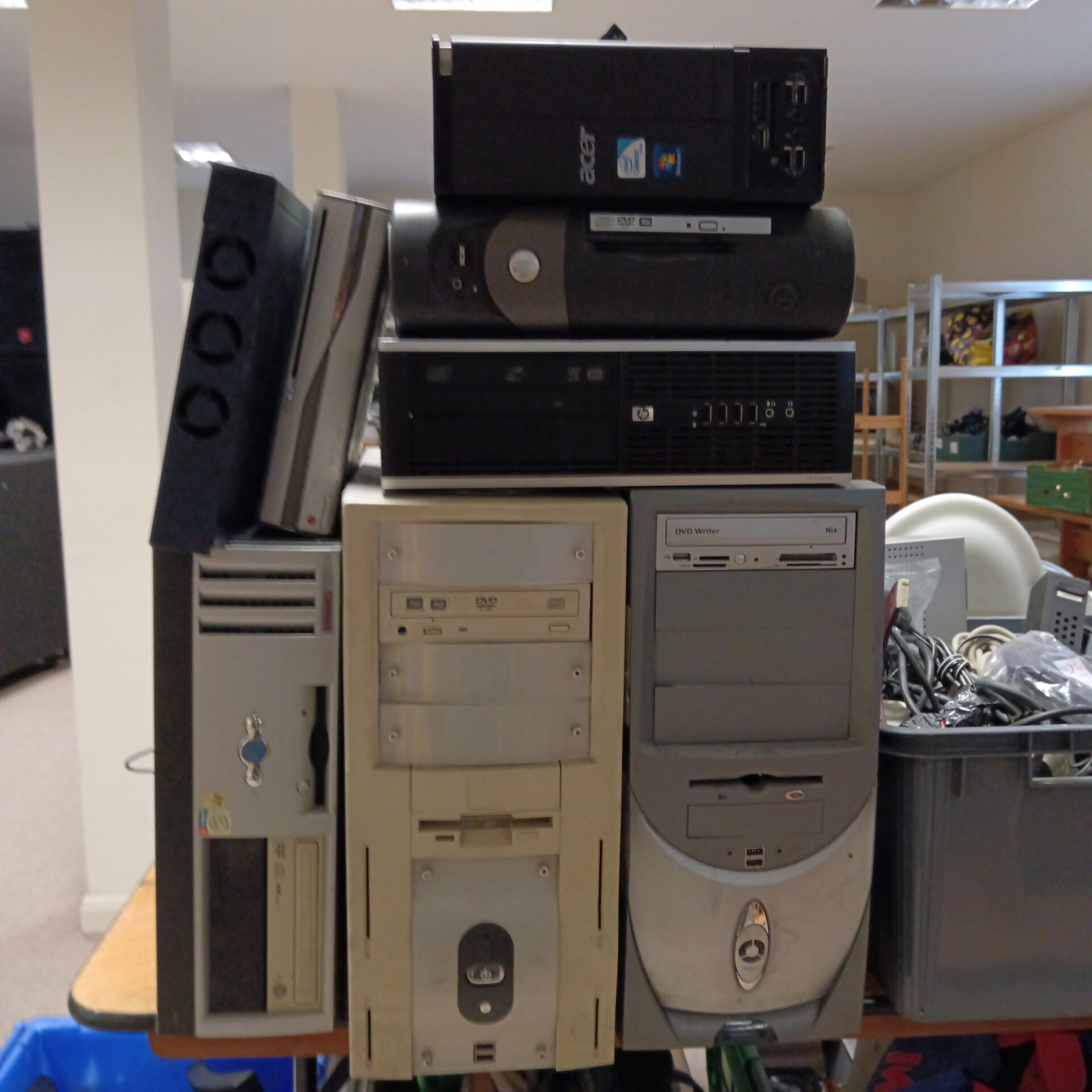 This lot comprises multiple desktop computer towers from HP and Acer. These represent typical mid-tower form factors common in the early to mid-2000s, designed for home or office use. The towers exhibit the standard features of the era, including front-panel USB and audio ports, and internal bays for hard drives, optical drives, and expansion cards.