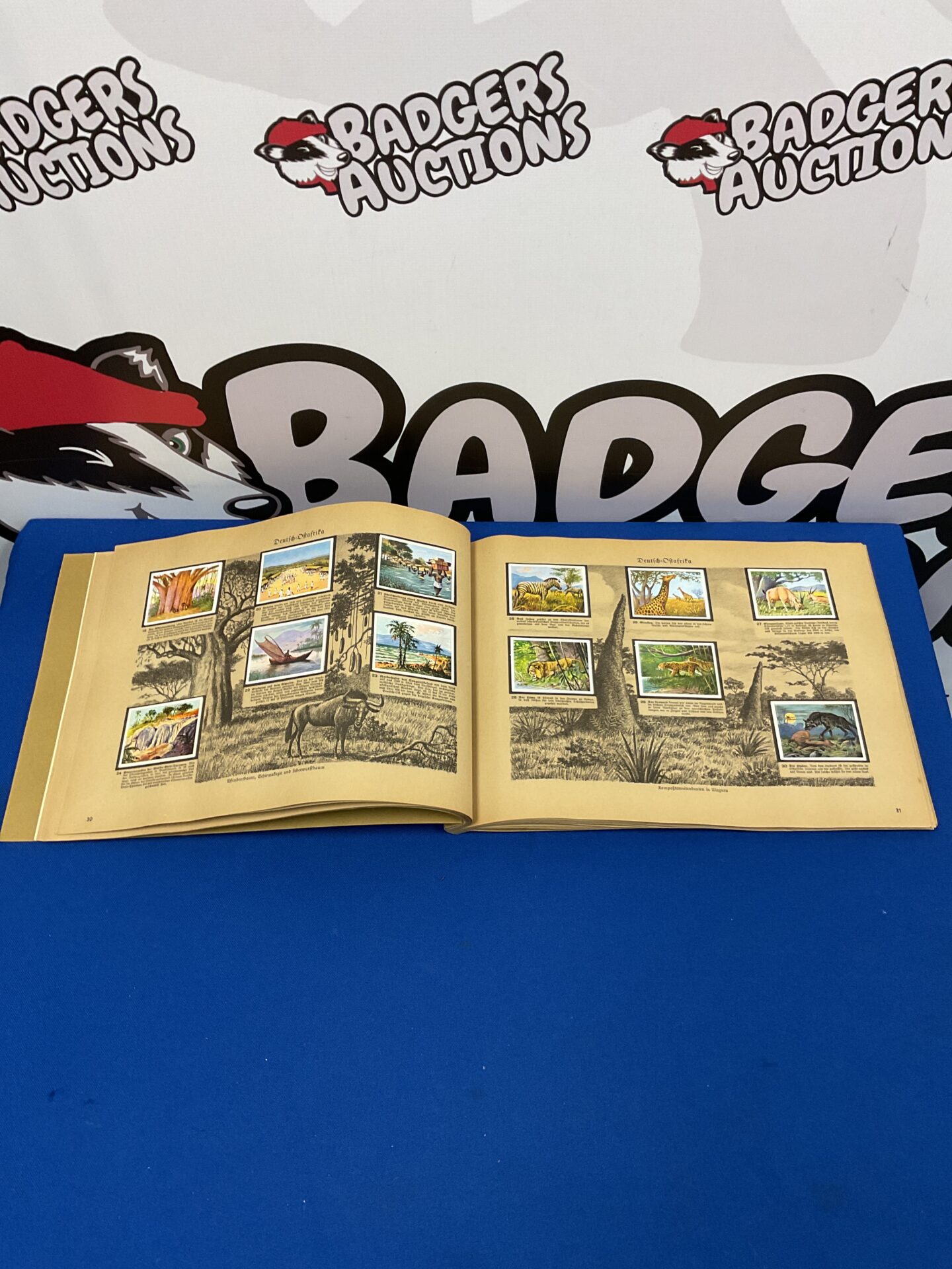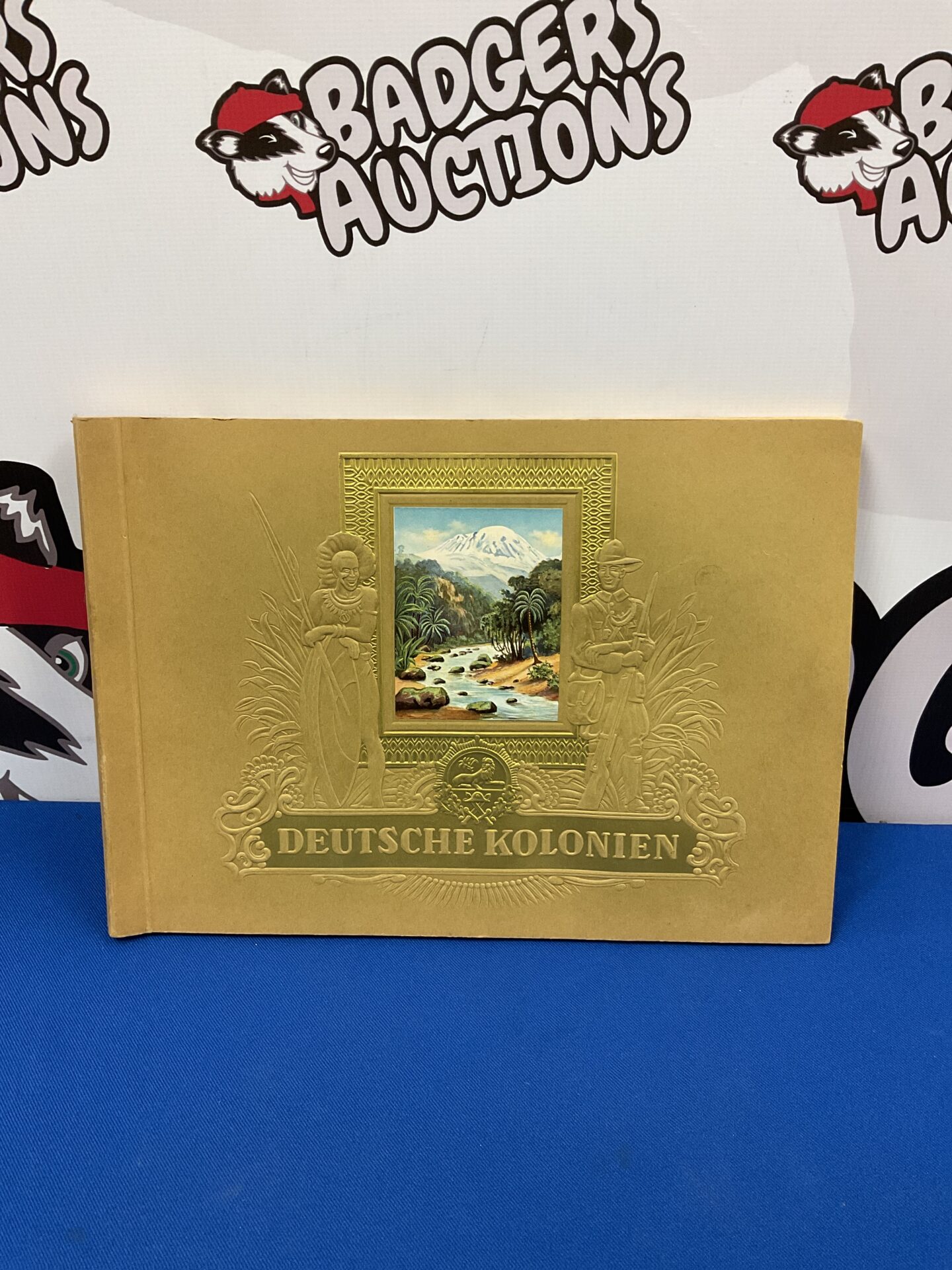 This album contains a collection of cigarette cards produced by Dresden in the 1930s, depicting scenes from the German colonial empire. The cards showcase various aspects of life in these colonies, including landscapes, people, flora, and fauna. The album itself features a decorative cover with embossed detailing and a presentation style typical of the era, designed to house and display these collectible cards.