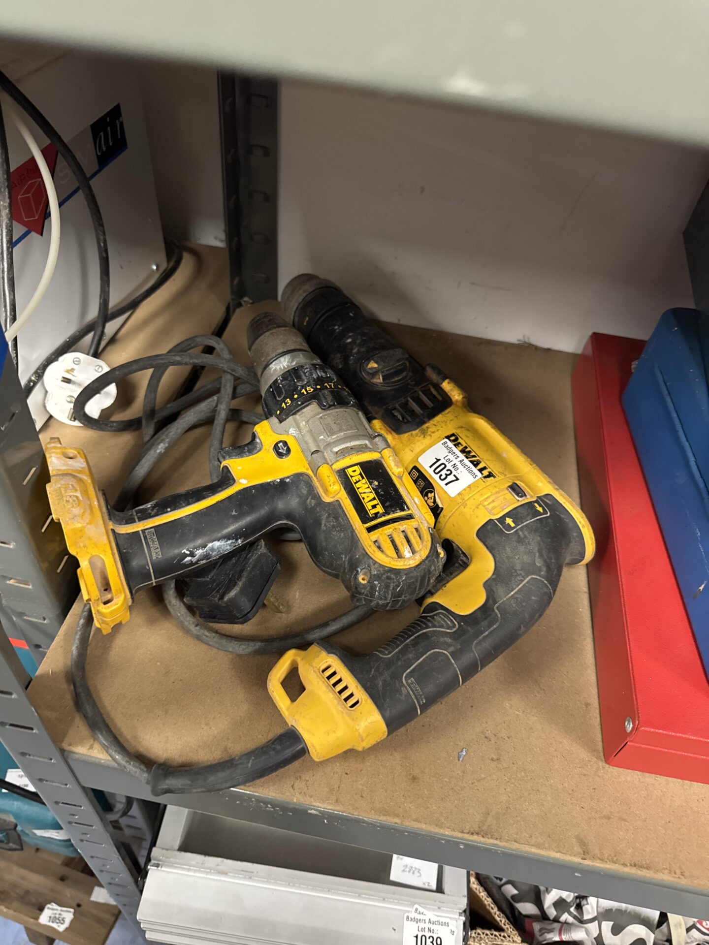This lot features a Dewalt corded drill, a robust and reliable power tool designed for various drilling and fastening applications. The drill boasts a powerful motor and a keyless chuck for quick and easy bit changes. Alongside the corded drill is a Dewalt cordless drill, adding versatility to the set.