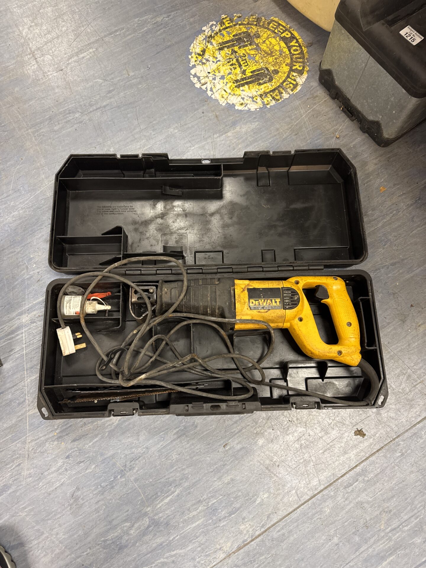 This Dewalt reciprocating saw shows signs of use, consistent with a tool of its type. The saw’s housing exhibits wear and tear, and the blade may require sharpening or replacement. Despite this, the saw appears structurally sound and may be of interest to collectors of power tools or those seeking a functional saw for projects.