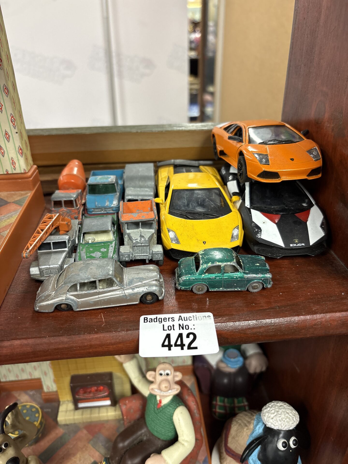 This lot comprises a selection of diecast model cars, including vintage examples from Lesney and more recent models from Kinsmart. The collection features a variety of vehicle types and colours, offering a diverse range for collectors or enthusiasts. The models showcase varying degrees of detail and scale, reflecting different eras of toy car manufacturing.