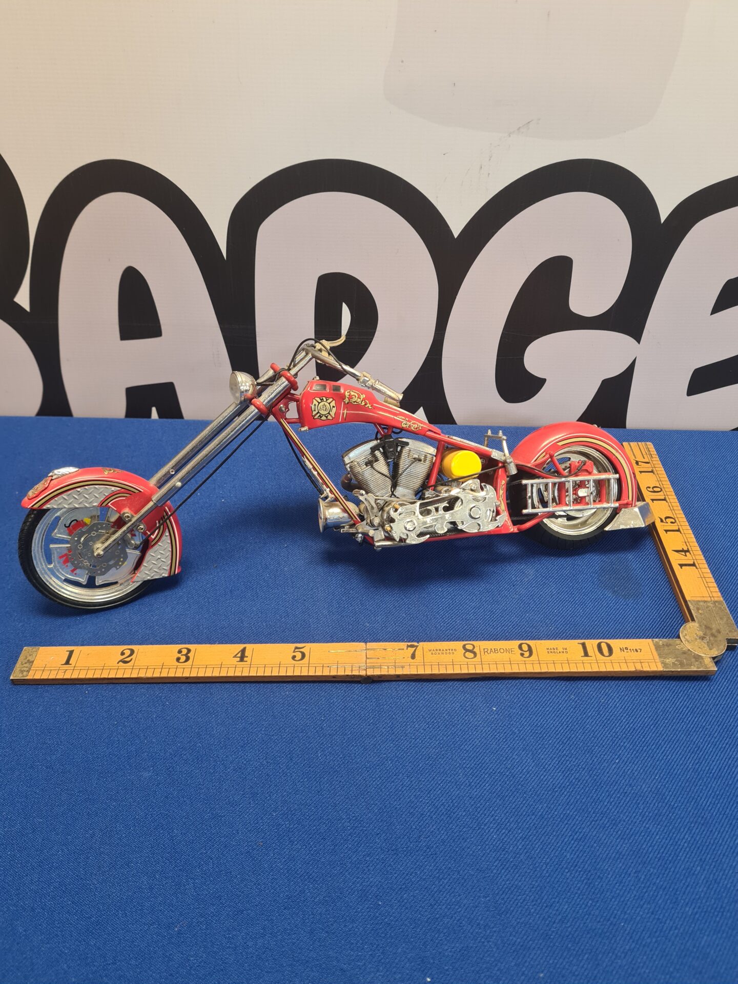 This is a highly detailed diecast motorcycle model inspired by the New York Fire Department. The model features intricate detailing, including a realistic engine, working steering, and authentic decals. It’s a stunning replica of a custom chopper, showcasing a vibrant red finish and chrome accents. This model is a testament to craftsmanship and attention to detail, making it a standout piece for any collection.