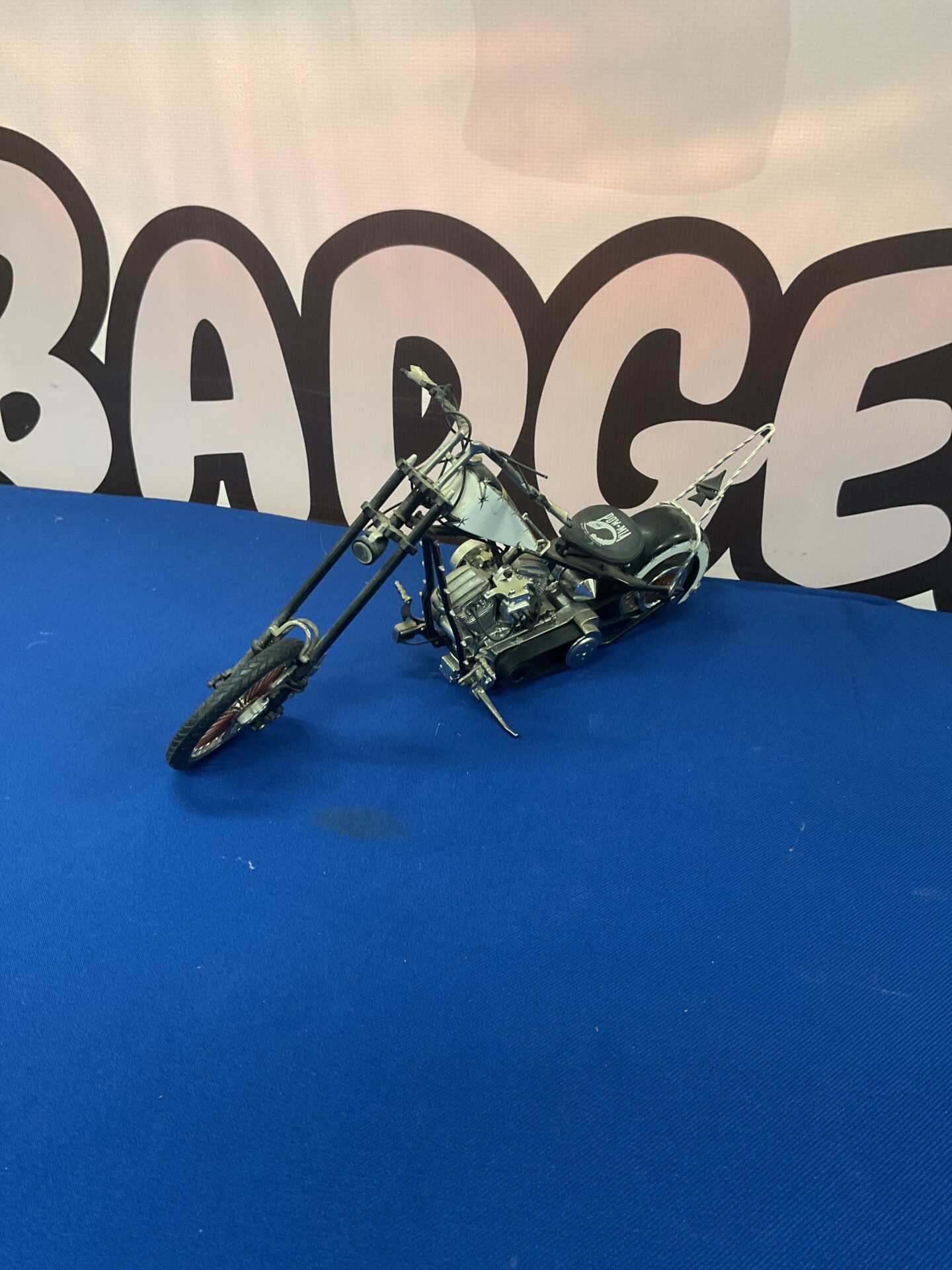 This is a highly detailed diecast motorcycle, inspired by the Joyride Pow Mia design. This model showcases intricate craftsmanship and attention to detail, capturing the essence of the original motorcycle. The model features realistic paintwork, detailed engine components, and accurately replicated bodywork, making it a standout piece for collectors and enthusiasts.