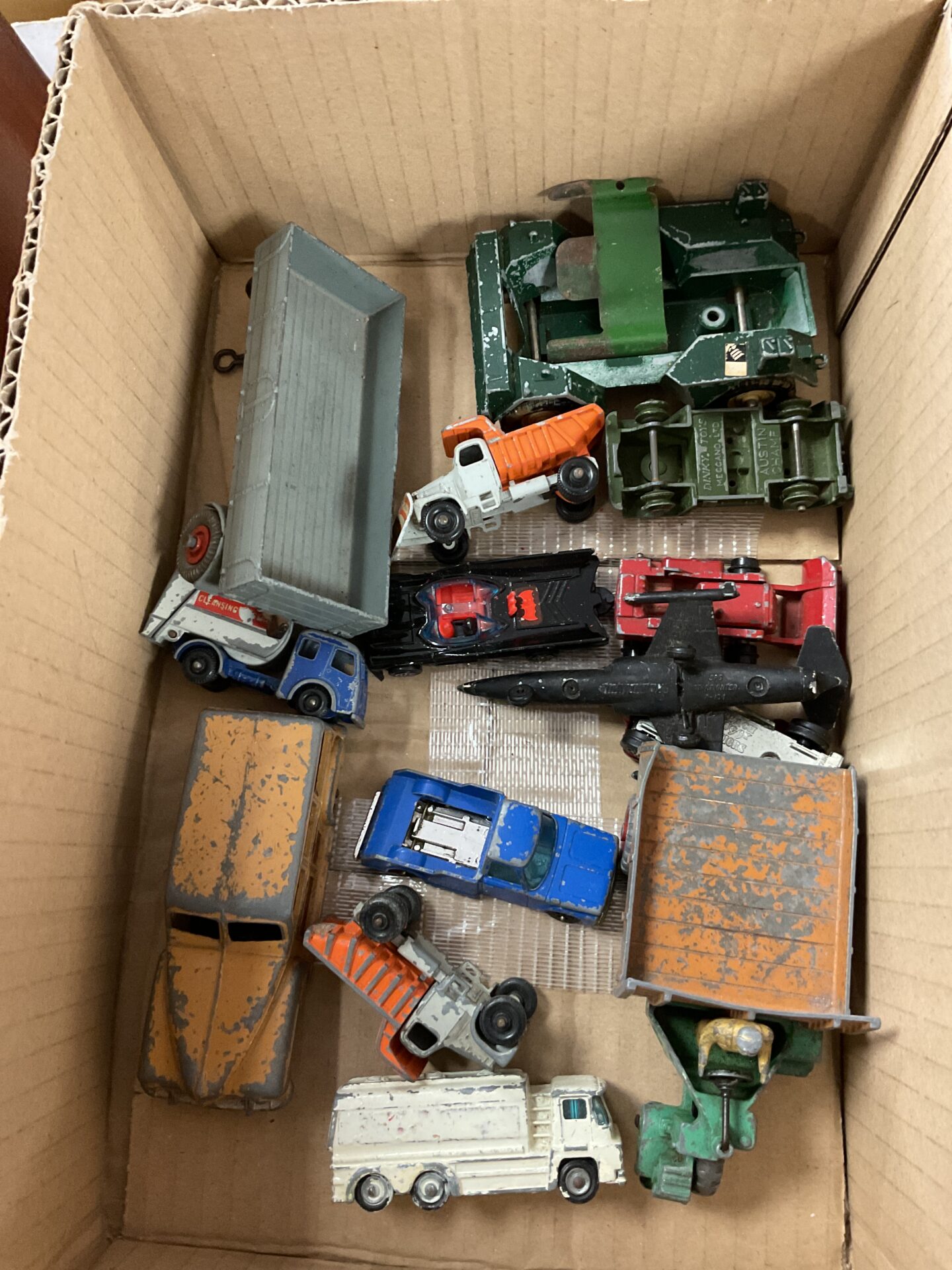 This lot comprises a collection of vintage and modern diecast vehicles. The assortment includes examples from popular brands like Dinky, Matchbox, and Corgi, offering a diverse range of models. The vehicles represent various types, including cars, trucks, and commercial vehicles, appealing to collectors and enthusiasts alike.