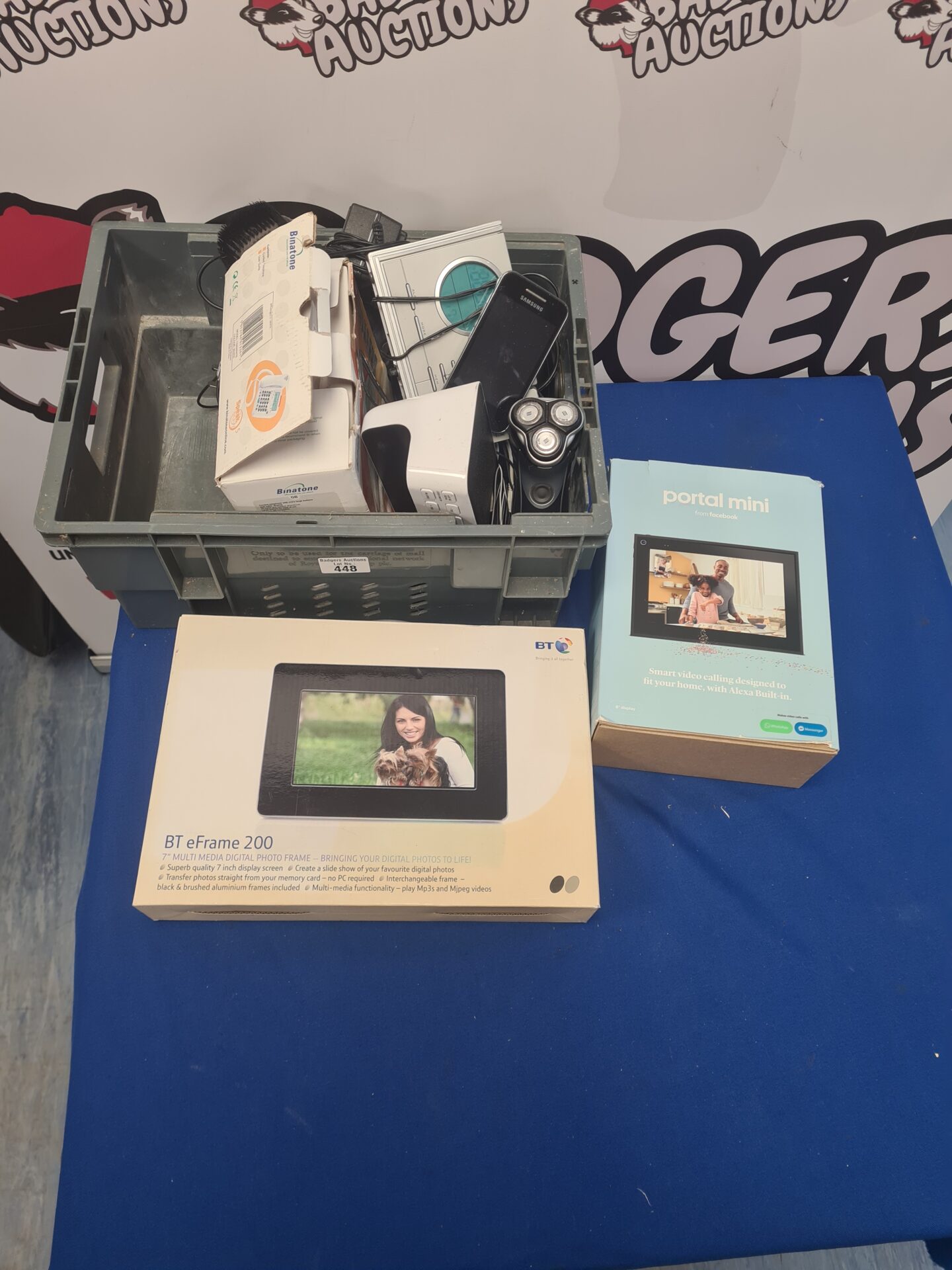 This lot includes a BT eFrame digital photo frame and a Facebook Portal Mini smart display. The BT eFrame allows you to display a rotating selection of your favourite photos, bringing cherished memories to life. The Facebook Portal Mini offers video calling, voice control, and access to apps, connecting you with loved ones and providing entertainment.
